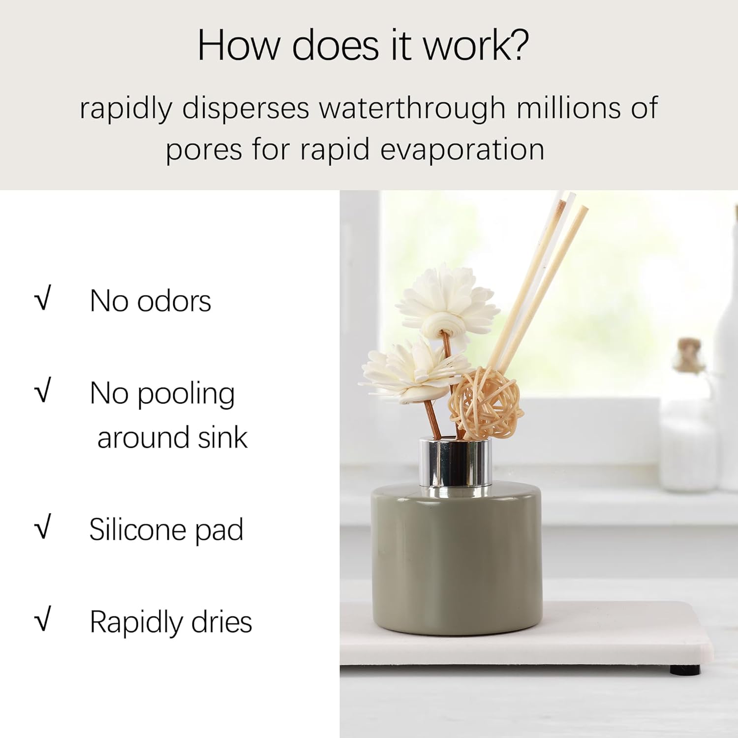 • Made from natural Diatom mud and plant fiber, small holes within diatomite enable it have amazing water absorption. They could absorb water and gets dry in a few minutes. It makes the Bathroom Counter top more dry and tidy.