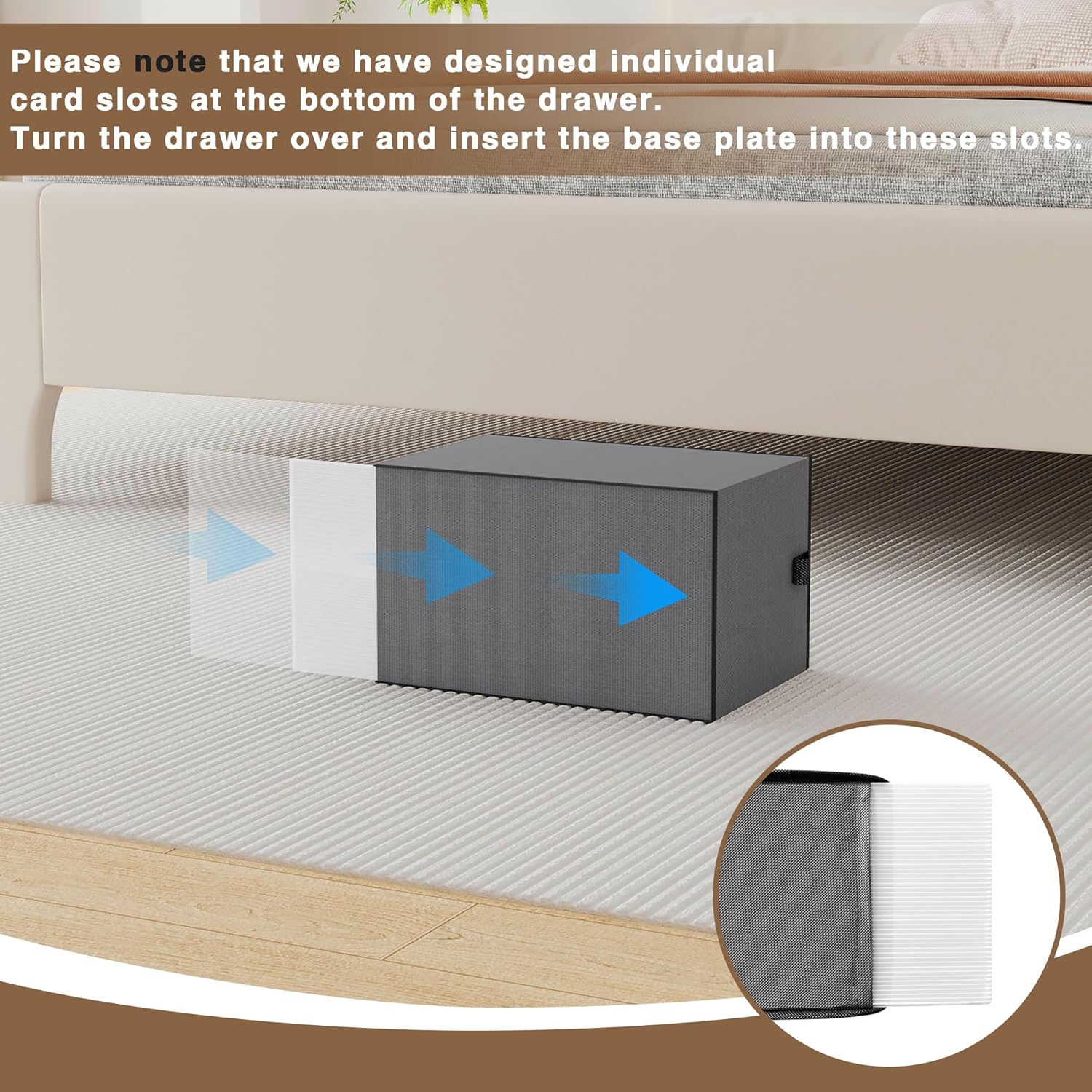 • Please note that we have designed individual card slots at the bottom of the drawer. Turn the drawer over and insert the base plate into these slots.