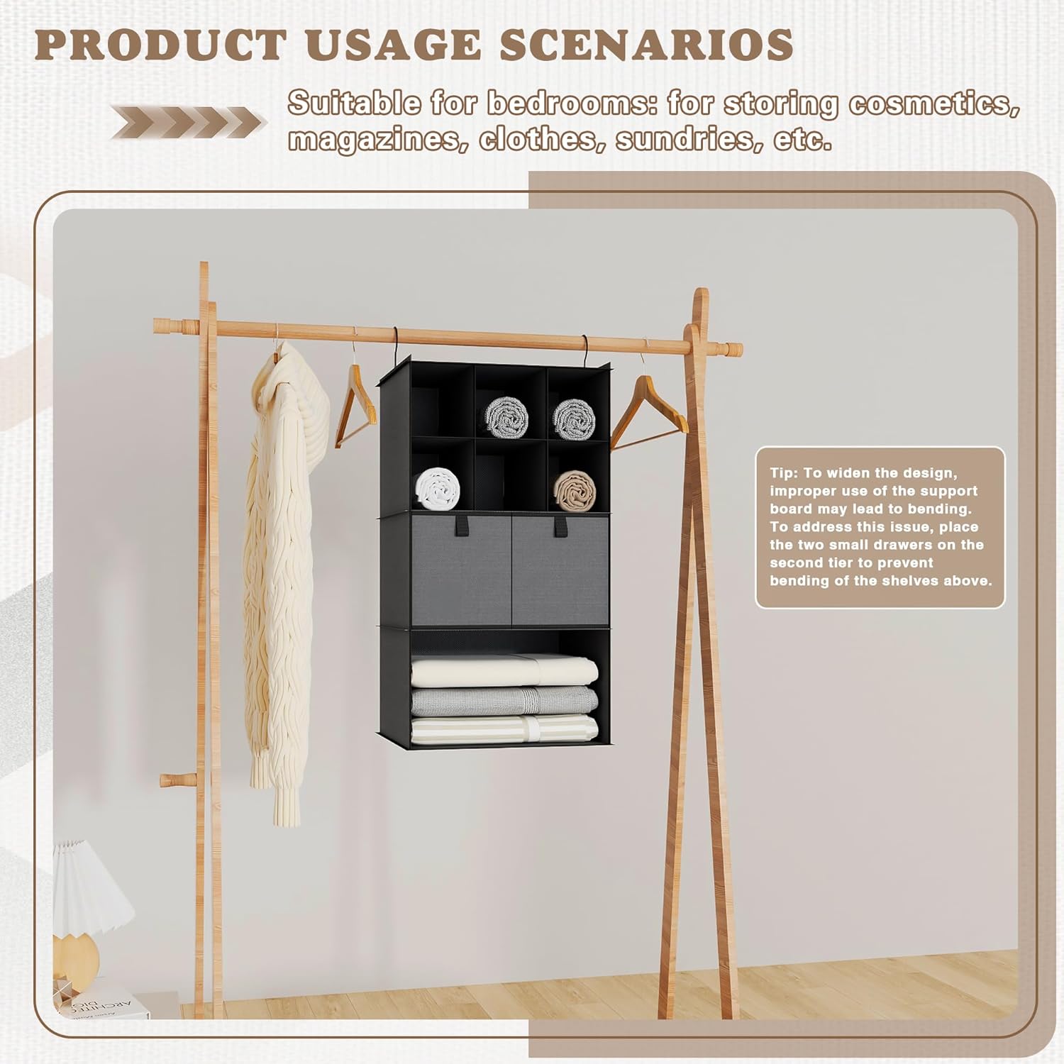 • Tip: To widen the design, improper use of the support board may lead to bending. To address this issue, place the two small drawers on the second tier to prevent bending of the shelves above.