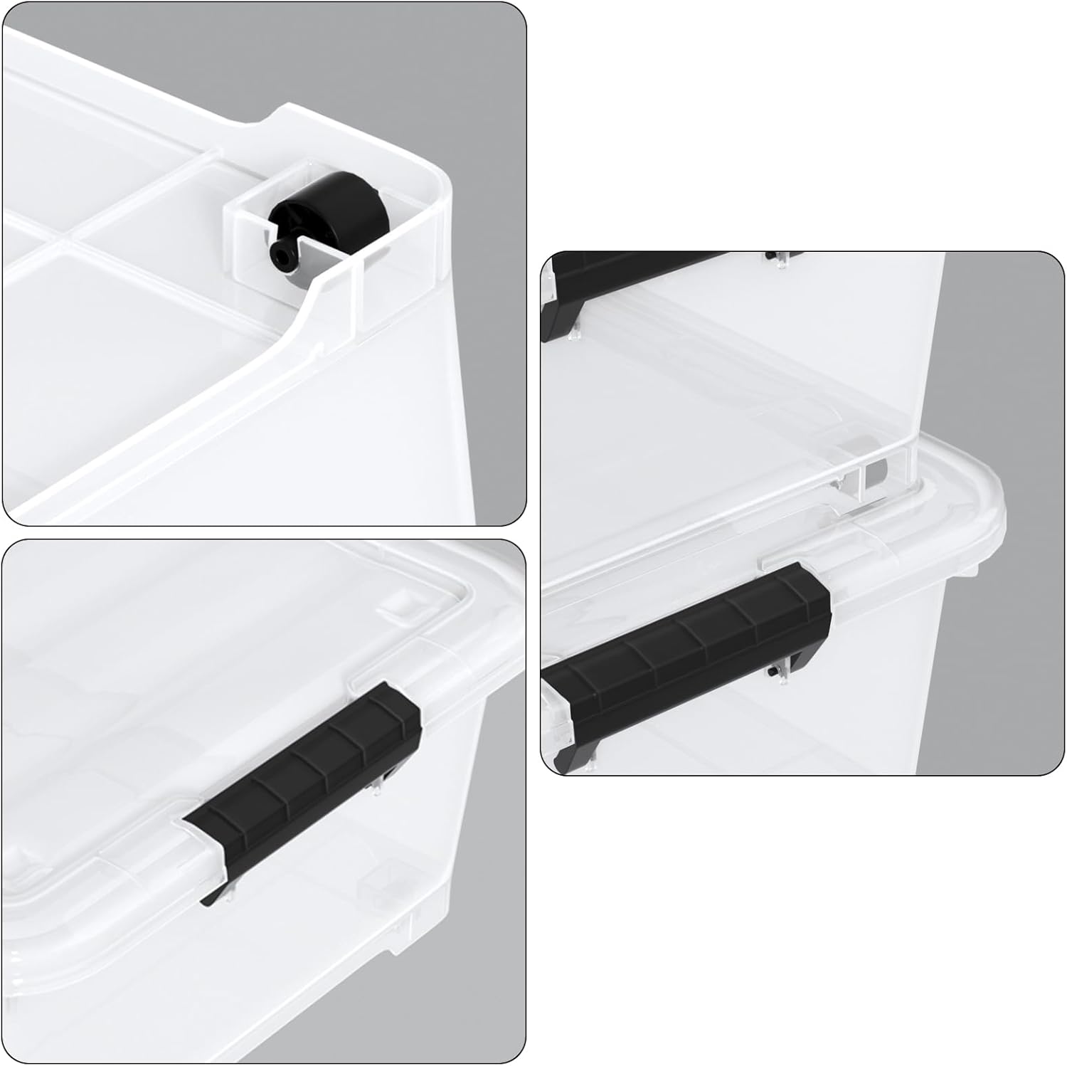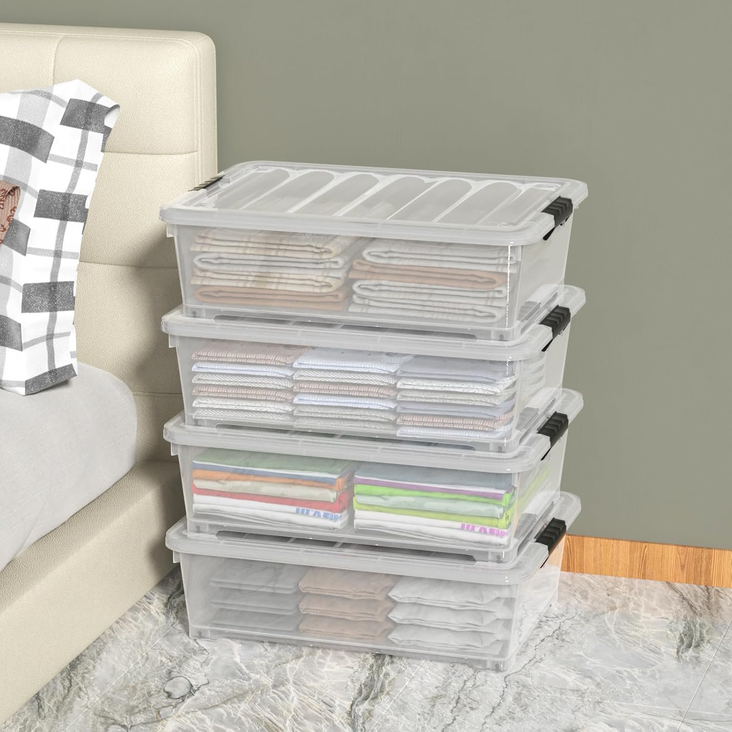 25 Quart Clear Under Bed Storage Container with Wheels, 4 Packs Stackable Plastic Underbed Bin with Lid