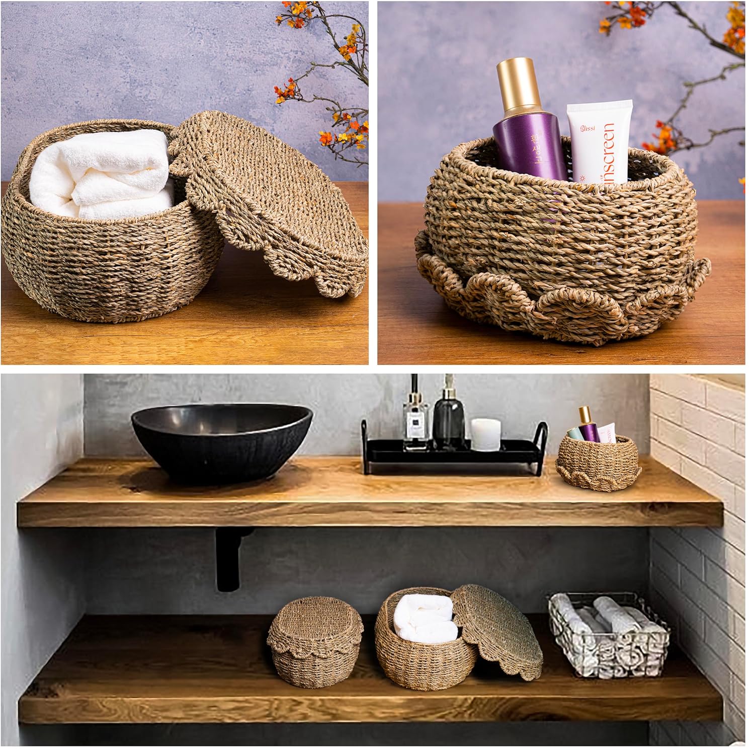 • Durable Material: Our set of 3 wicker storage baskets with lids is crafted from natural water hyacinth, ensuring durability and a charming rustic aesthetic. Featuring a scalloped edge design, these handwoven baskets are easy to open and close, keeping your belongings dust-free while seamlessly complementing your home décor.