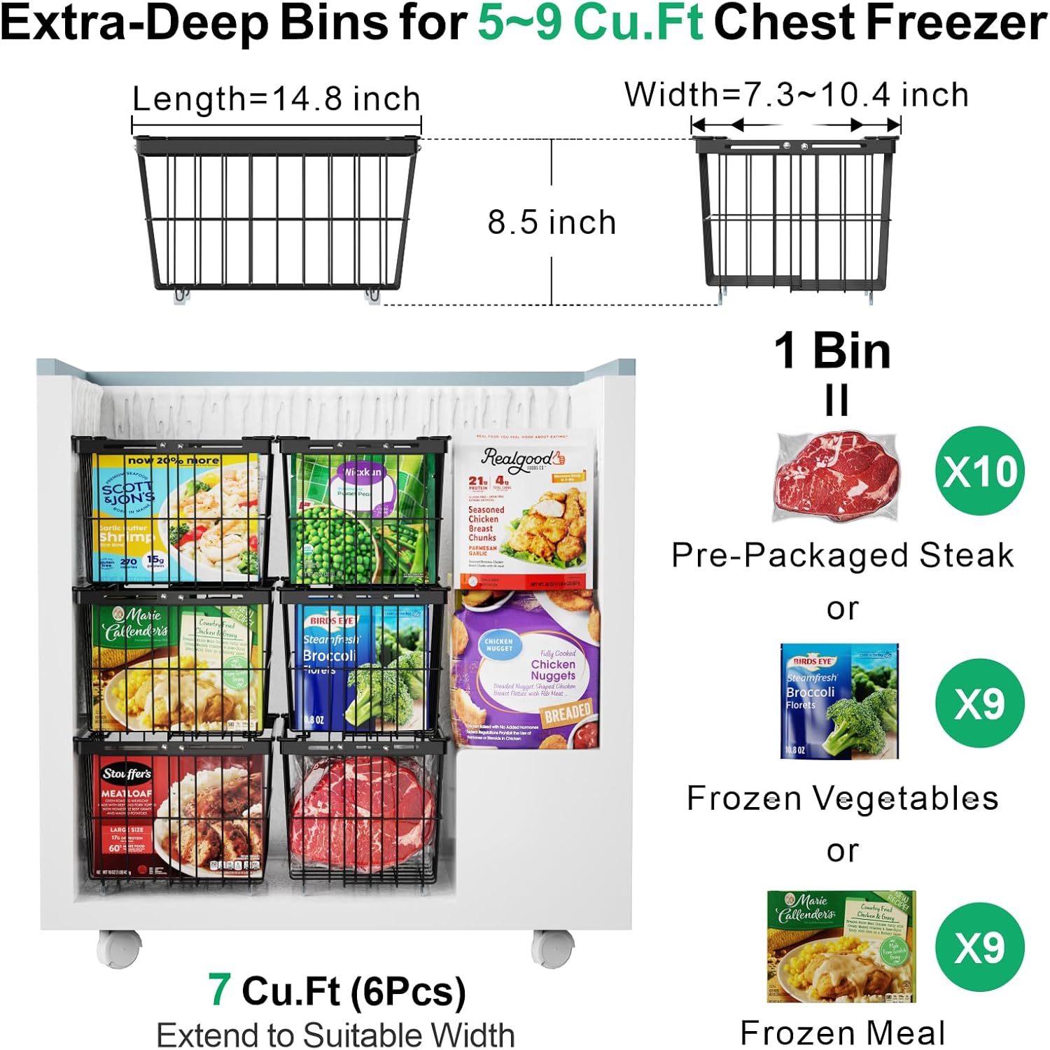 • [Customizable Fit for 5/7/9 cu ft Freezer]: iSPECLE freezer organizer bins are made in deeper & wider size 14.8" L x 7.1" to 10.63" W x 8.46" H; Adjust the width to fill up the available space in chest freezers; Holds 3 bins for 5 cu ft and 6 bins for 7/9 cu ft freezer, no wasted freezer space