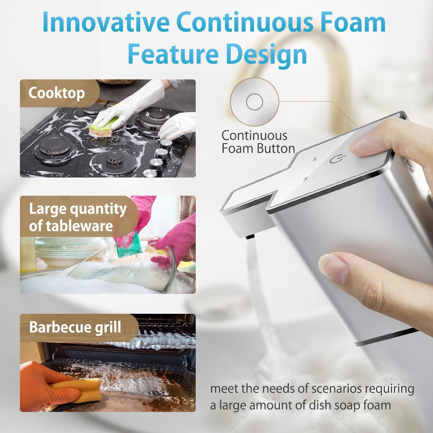 • 【Continuous Foam Design】 With a simple press of the continuous foam button, a steady stream of foam is effortlessly dispensed. This feature is perfect for tasks requiring large amounts of foaming soap, such as washing multiple utensils, cleaning stovetops, dining tables, barbecue grills, and more.