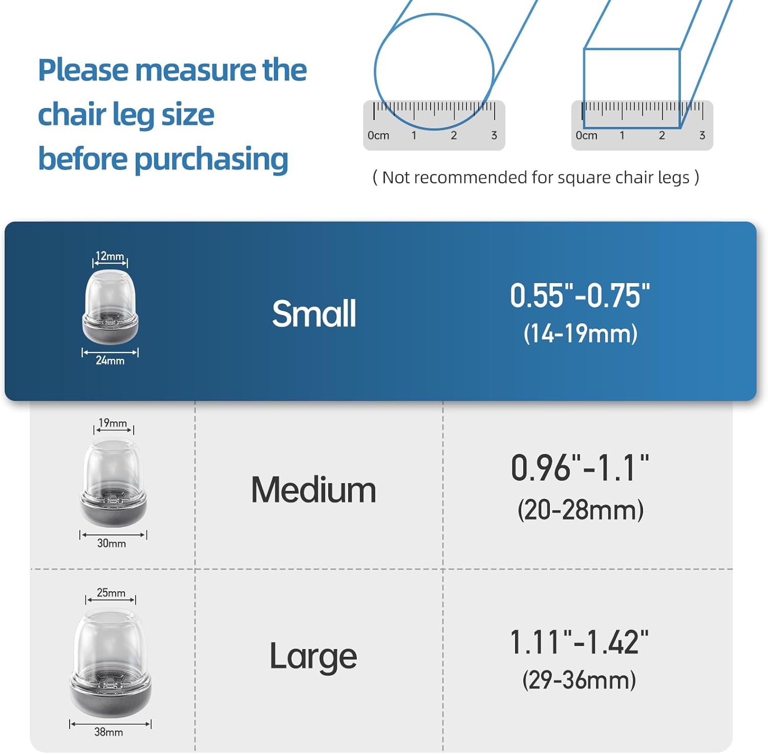 • [Multiple size options] Chair Leg Caps are elastic and can better adapt and fit the chair legs. We have three sizes (suitable chair leg diameter/side length: 0.63''-0.79''16-20mm ,0.83''-1.02''21-26mm ,1.10''-1.30''28-33mm) Warm reminder: Please carefully measure the diameter of the chair legs before ordering.