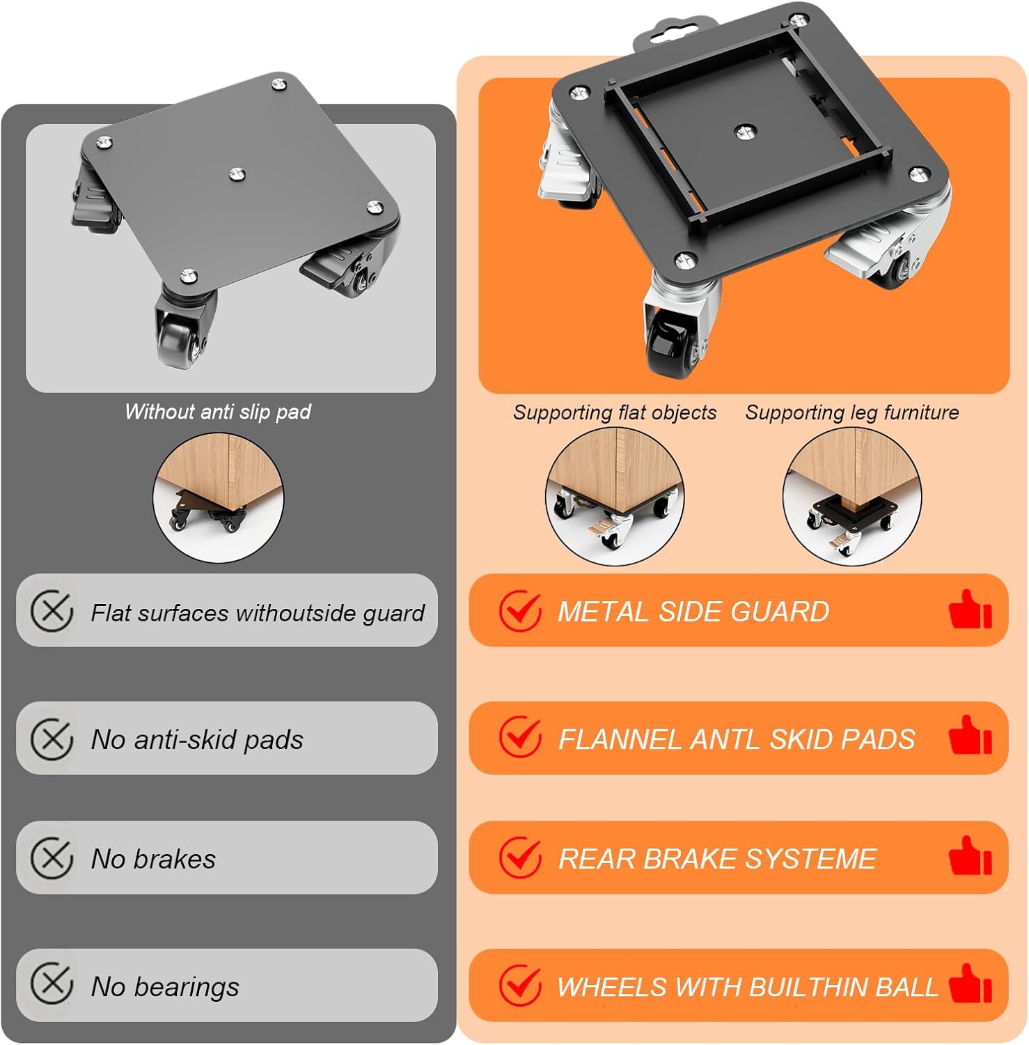 • Removable Side Guard Design: This upgraded heavy-duty furniture dolly features secure metal side guards that stabilize items with legs, preventing tipping during transport. Perfect for safely moving tables, chairs, and other furniture, this design ensures controlled, secure transportation.