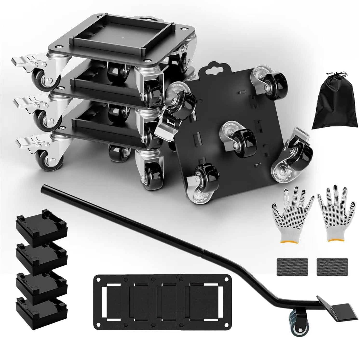 • Complete Furniture Lifter Tool: This set includes four 6.33"x6.33" dollies, 4 anti-skid pads, 16 removable side guards, 1 elastic cord, 1 crowbar, 2 anti-skid crowbar pads, 4 height-raising blocks, 1 pair of gloves, and 1 canvas bag—everything you need for efficient and safe moving.
