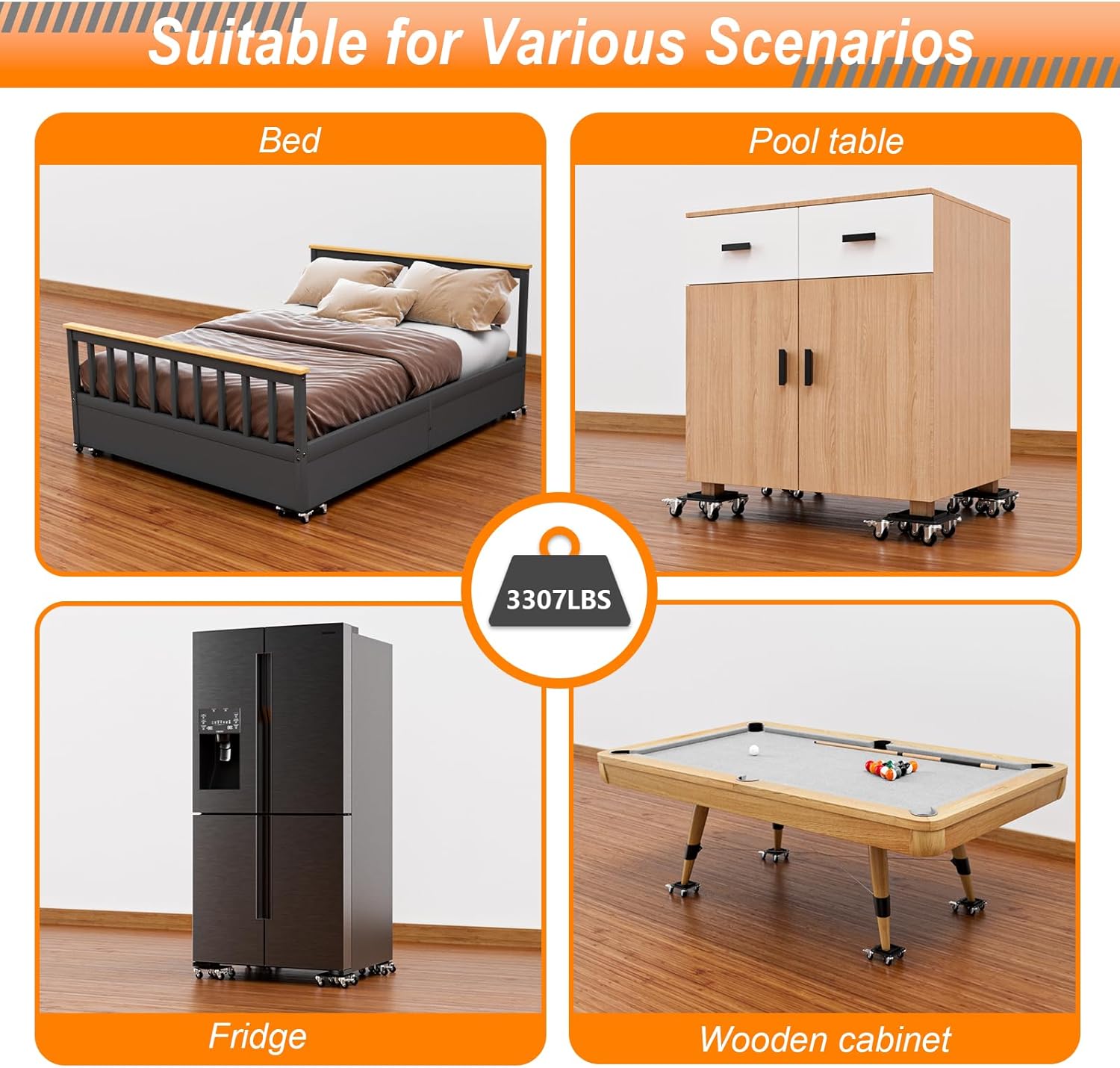 • Versatile for All Furniture: Ideal for moving sofas, beds, wardrobes, refrigerators, pianos, and other large appliances. Designed for smooth use on wood and tile floors, this dolly glides effortlessly—note: not suitable for uneven floors or high-pile carpets.