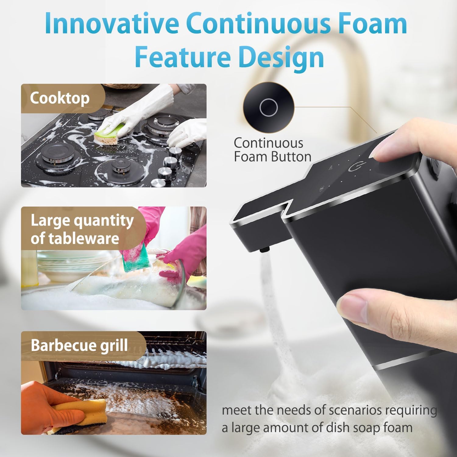 • 【Continuous Foam Design】 With a simple press of the continuous foam button, a steady stream of foam is effortlessly dispensed. This feature is perfect for tasks requiring large amounts of foaming soap, such as washing multiple utensils, cleaning stovetops, dining tables, barbecue grills, and more.