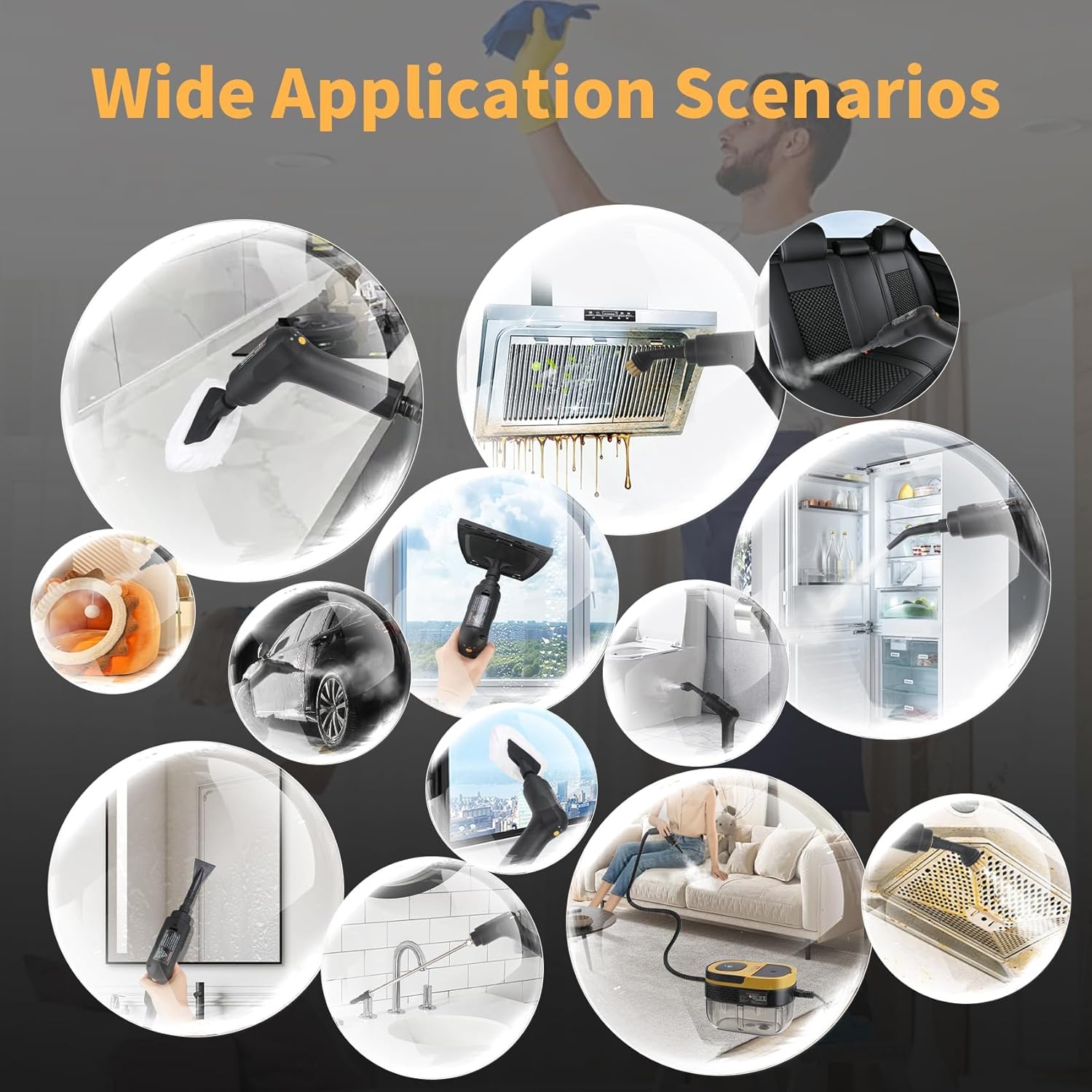 • 【Widely used】Widely used in kitchen, bathroom, and living room, such as cleaning range hood, stove, refrigerator, bathtub, interior decoration, grouting, tiles, windows, sofa, flooring, carpets, washing machine, refrigerator, mud, and tiles.(It is not recommended to use a high-temperature steam machine on cold glass.)