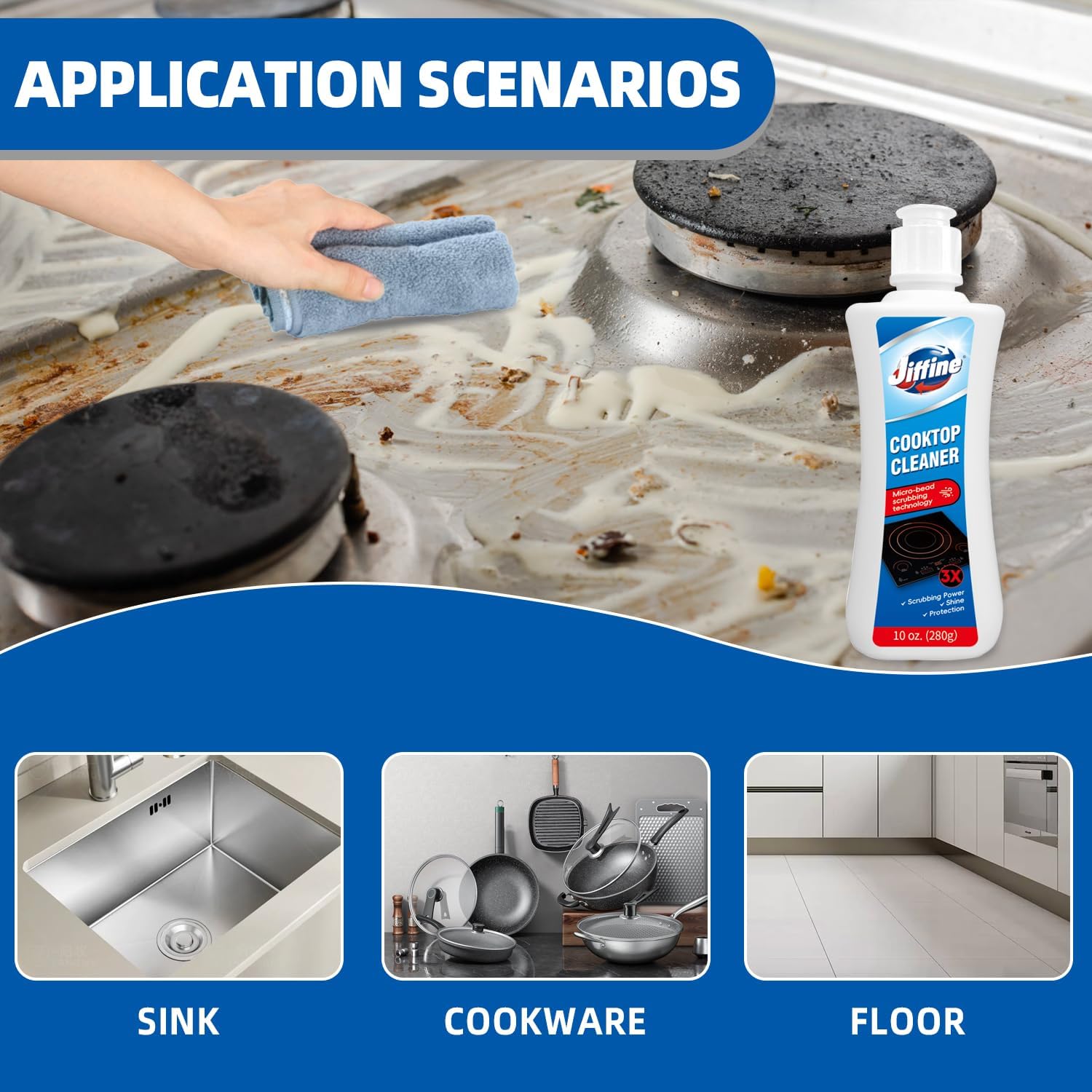 • Scratch-Free & Non-Abrasive Formula:Featuring advanced Micro-bead scrubbing technology, this cleaner lifts tough stains without scratching or damaging your cooktop. The gentle yet effective formula ensures safe cleaning for glass, ceramic, induction, and radiant cooktops.
