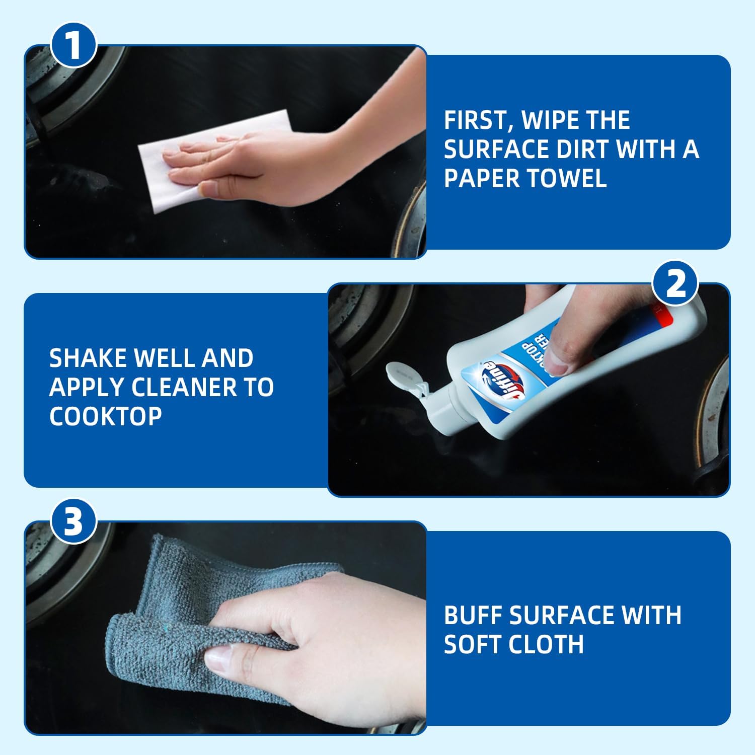 • Powerful Cleaning & Polishing:Our specially formulated cleaner easily removes grease, grime, and common stains from your stovetop. For everyday messes, simply apply and wipe—no extra tools required. Enjoy a streak-free, polished finish every time!