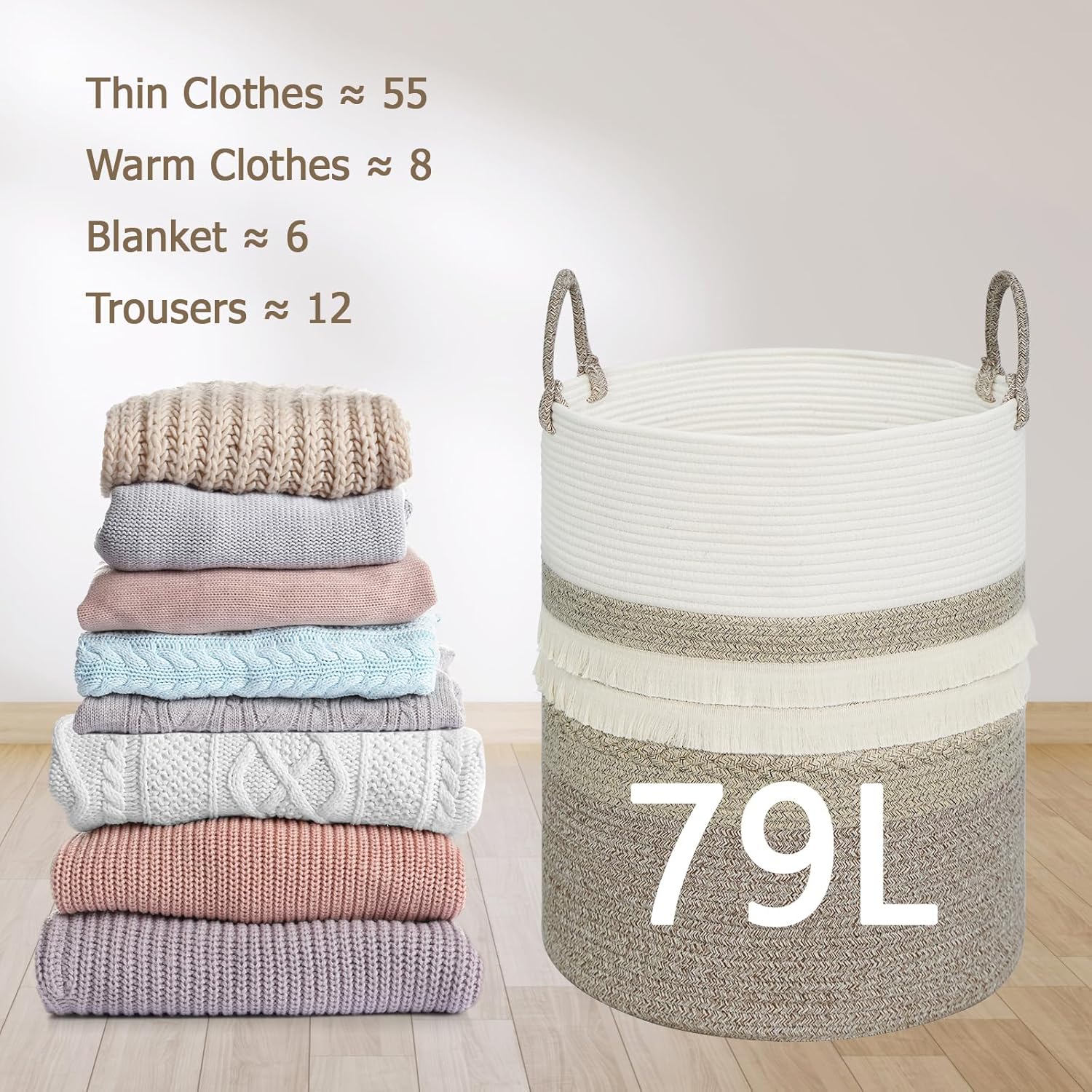 • Large Capacity: With its 79 L size, this large laundry basket holds all your clothes, blankets, and pillows. Whether it's for the bedroom, nursery, or kids' room, it’s spacious enough to handle heavy loads without a hassle. No more clutter – just easy storage