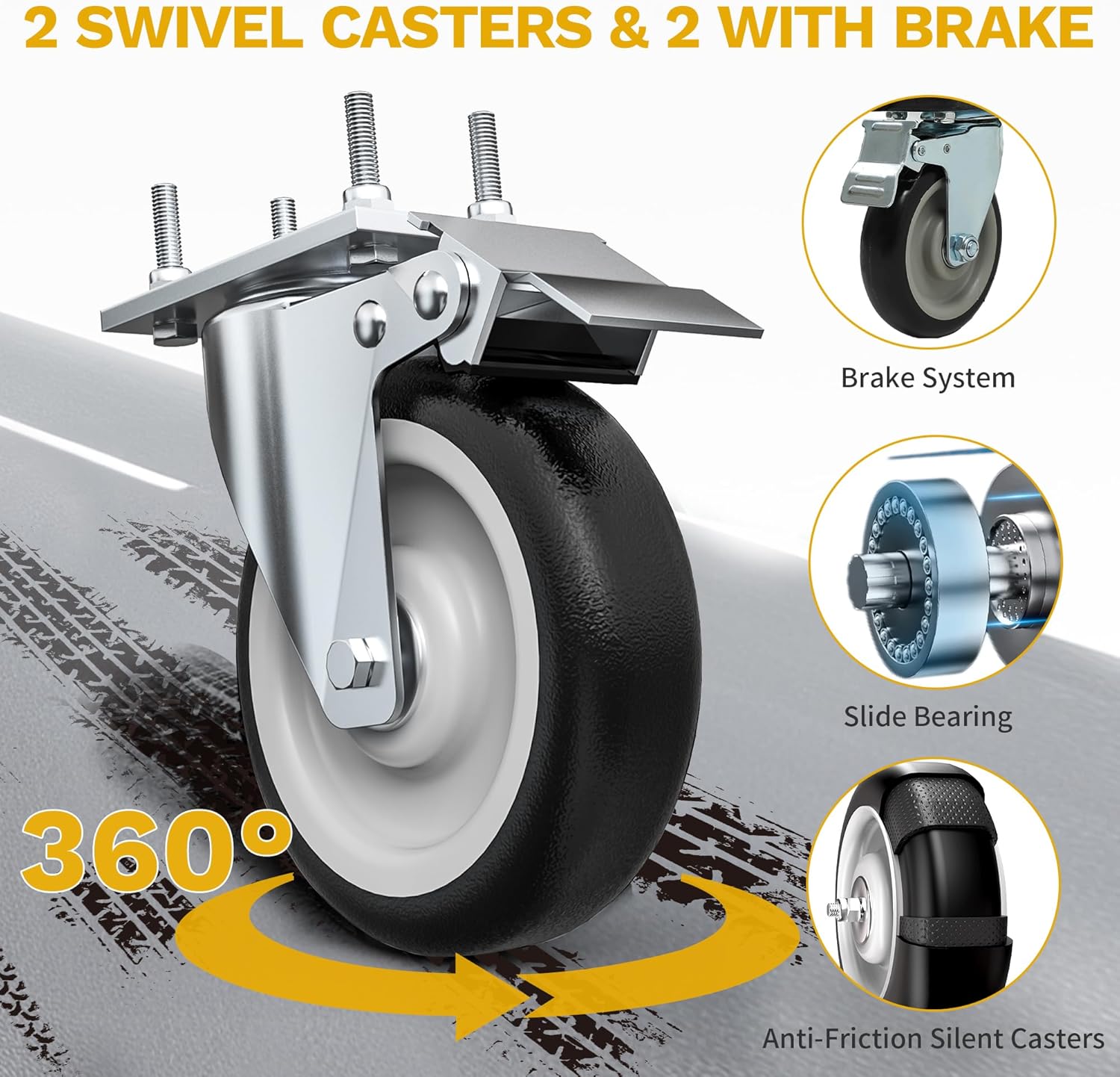 • Efficient Locking Wheels and Smooth Movement: The utility cart is equipped with four 5-inch swivel casters made from industrial-strength polypropylene, ensuring smooth movement and long-lasting durability. Two of the casters are lockable, providing enhanced 360-degree maneuverability and reducing effort during transport. Additionally, the thermoplastic rubber wrap on the wheels absorbs vibration, reduces noise, and prevents floor damage and carpet snags