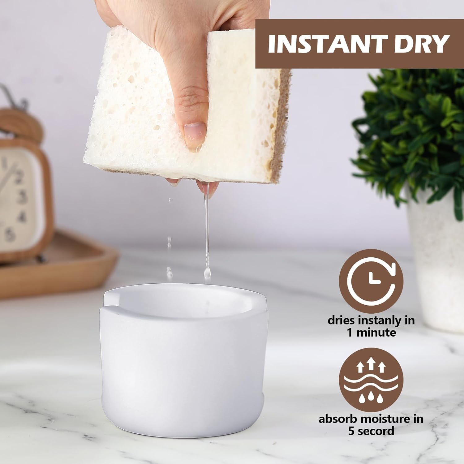 • Quick Drying and Water Absorption: the sponge rack is made of quality diatomite, which effectively absorbs excess water and makes the kitchen countertop clean and dry