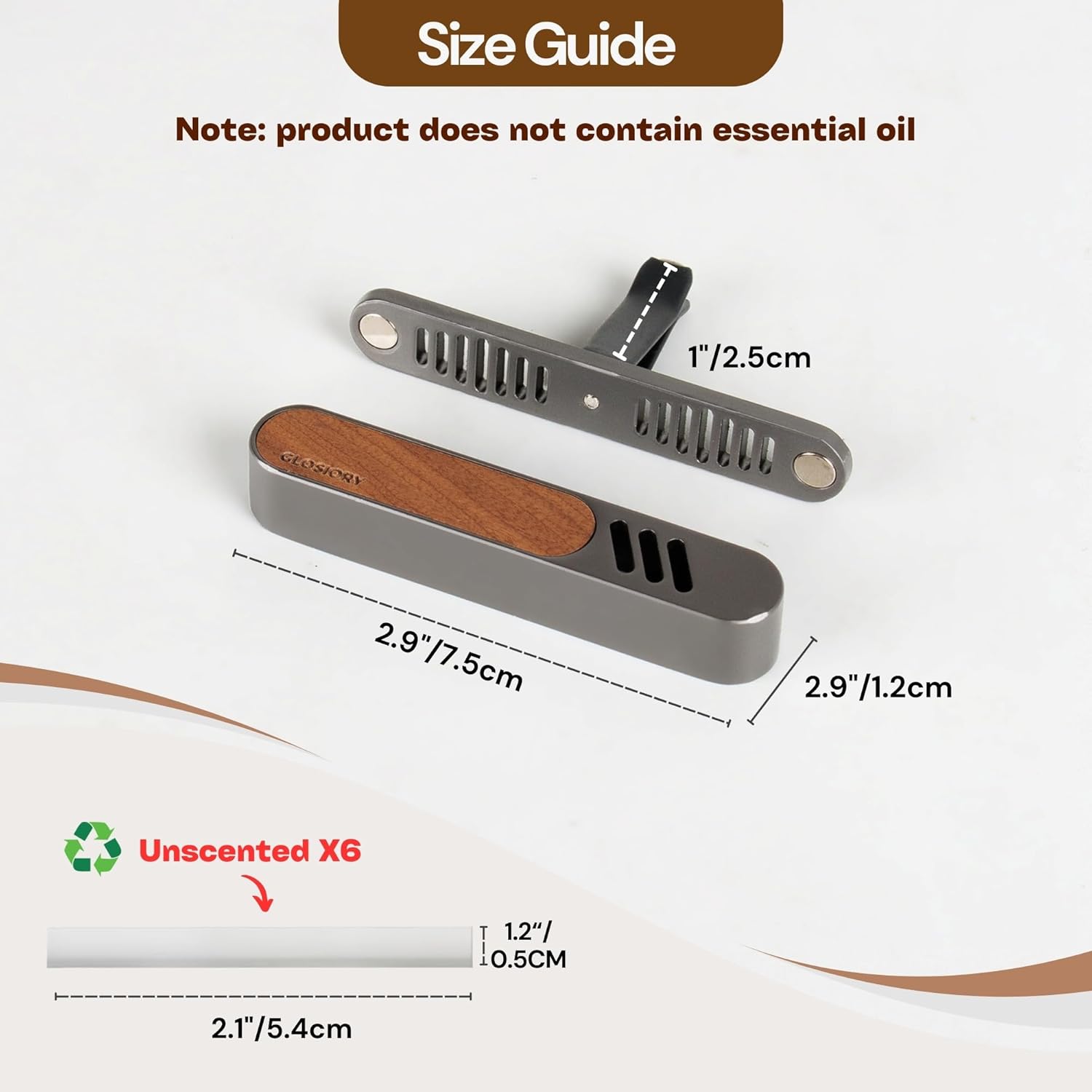 • PREMIUM DESIGN - The Glosiory car diffuser vent clips is expertly crafted from premium metal and natural walnut wood, offering a sophisticated and aesthetic that seamlessly complements any vehicle interior. Its timeless design not only serves as a functional car scent diffuser but also as a stylish car accessory that enhances your vehicle's ambiance and inteior.Adds a touch of luxury to any vehicle.- [Note: Natural wood grain varies,each piece is with different color&pattern.]