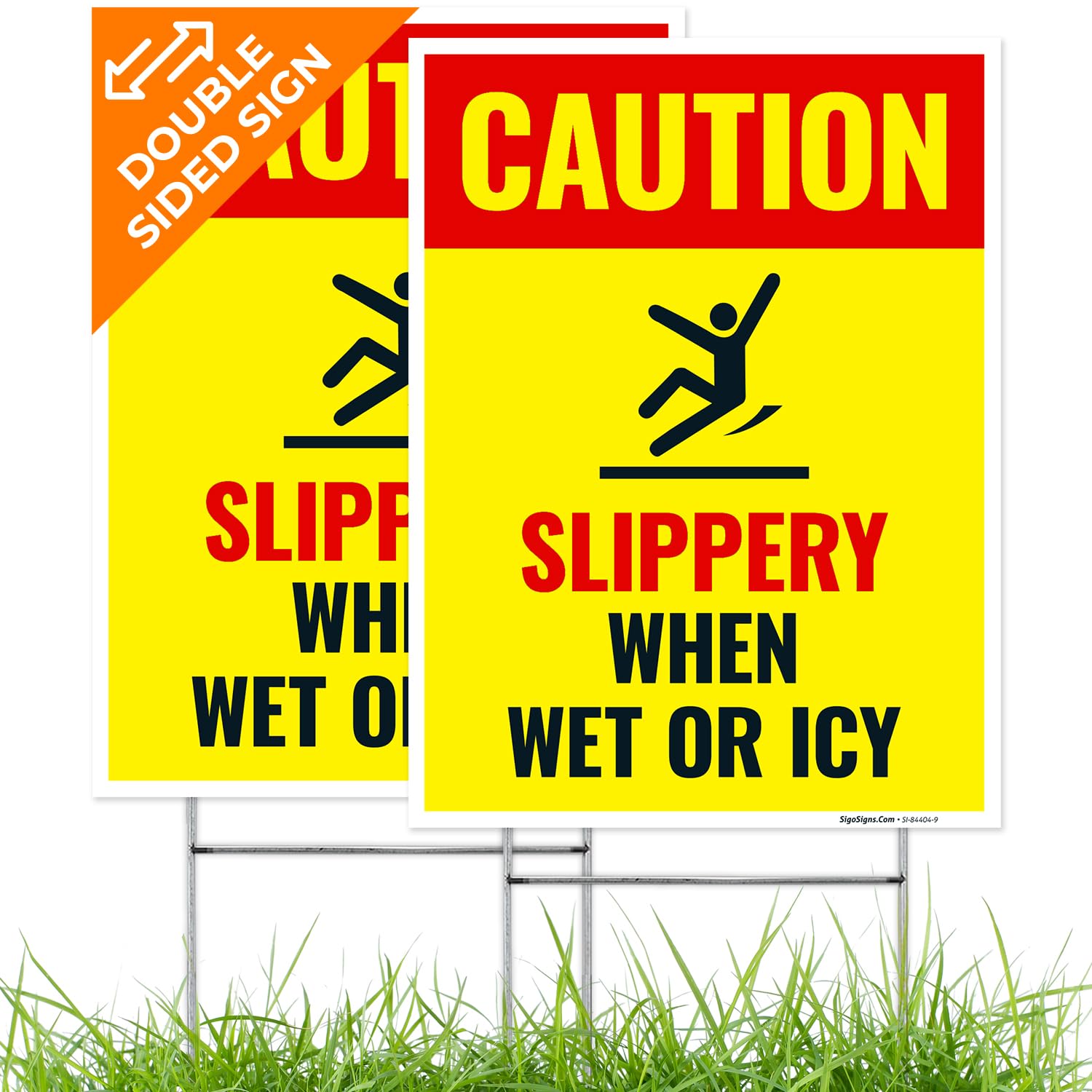 Caution Slippery When Wet or ICY Sign, (SI-84404) (2 Pack) Double Sided 9x12 Inches, Corrugated Plastic with Metal H Stake, Made in USA by Sigo Signs