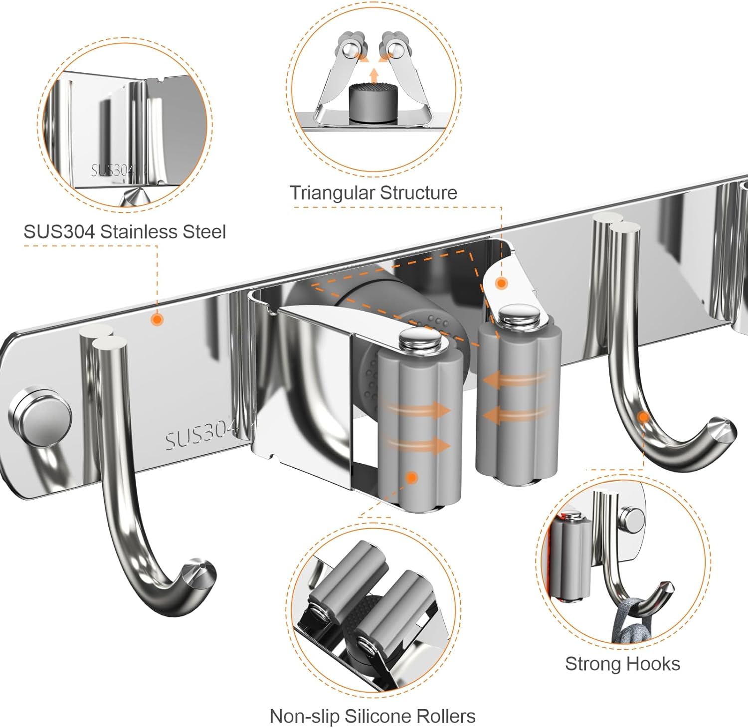 • STURDY AND FUNCTIONAL:The mop and broom holder wall mount is made of premium quality stainless steel, corrosion-resistant, rustproof and waterproof,wear-resistant, long-lasting and easy to clean