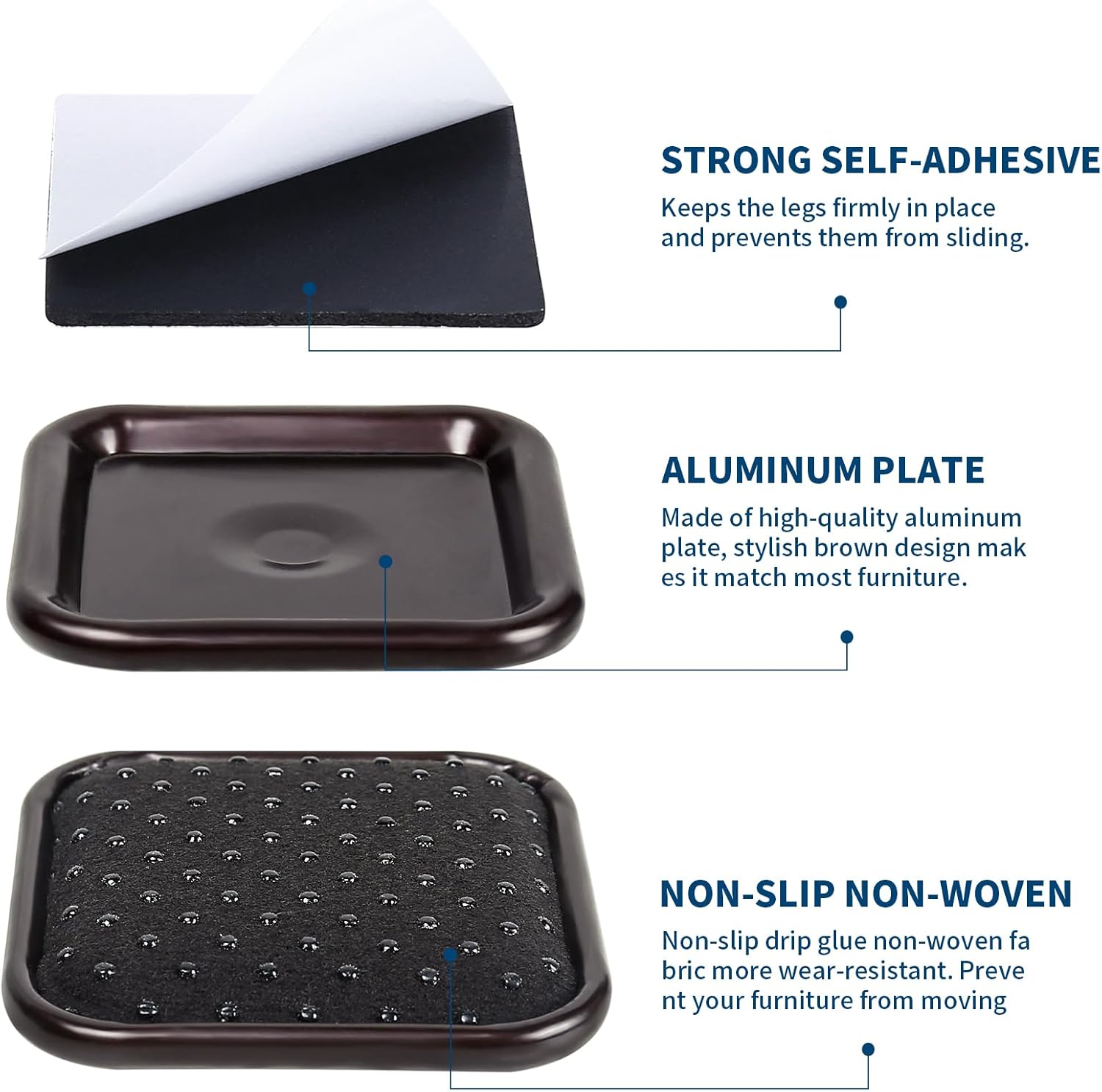 • 【Easy Installation】Step 1: tear off the white cover and press self-adhesive onto the surface of the aluminum plate. Step 2: slide them under your furniture legs and leave them for 10 minutes. Step 3: done.