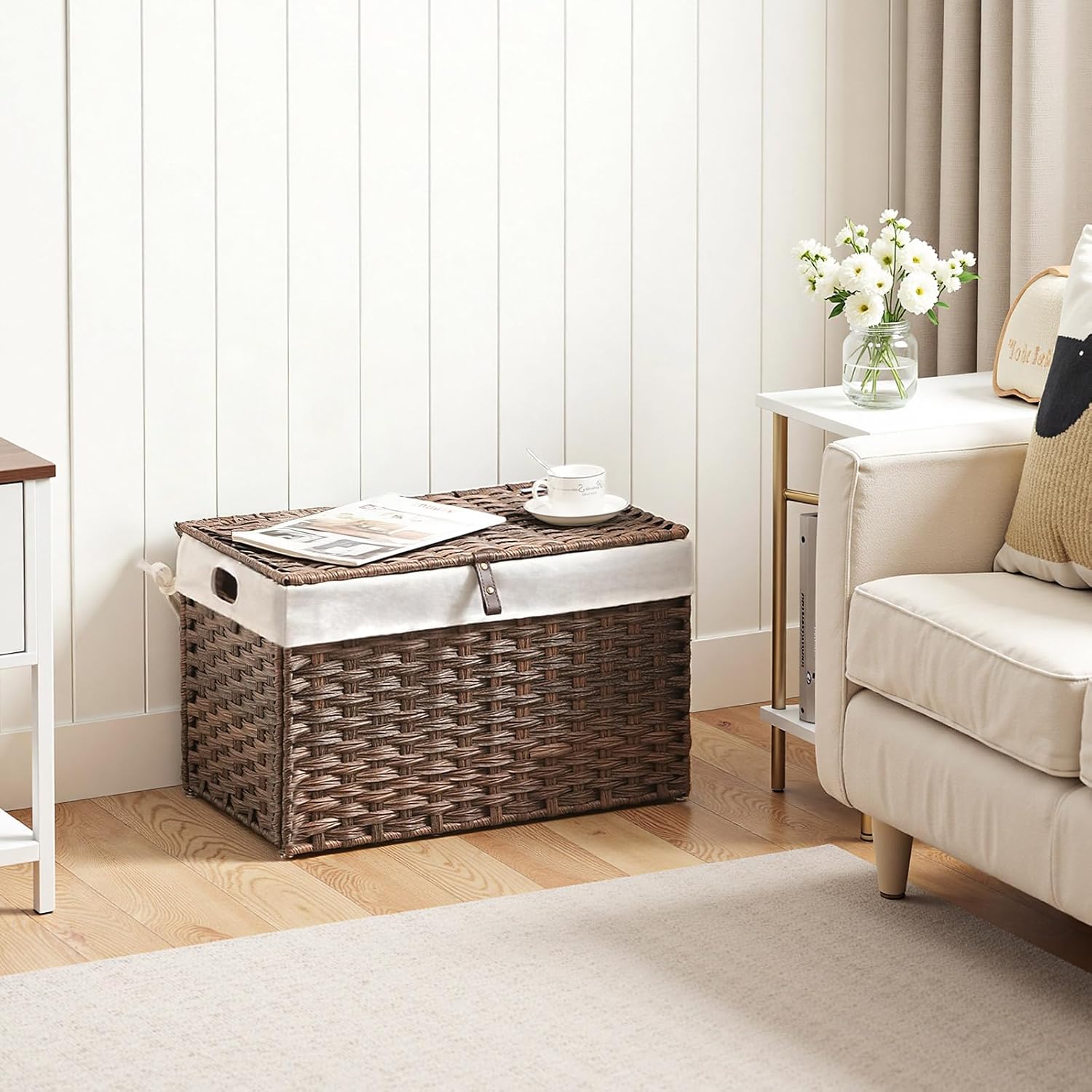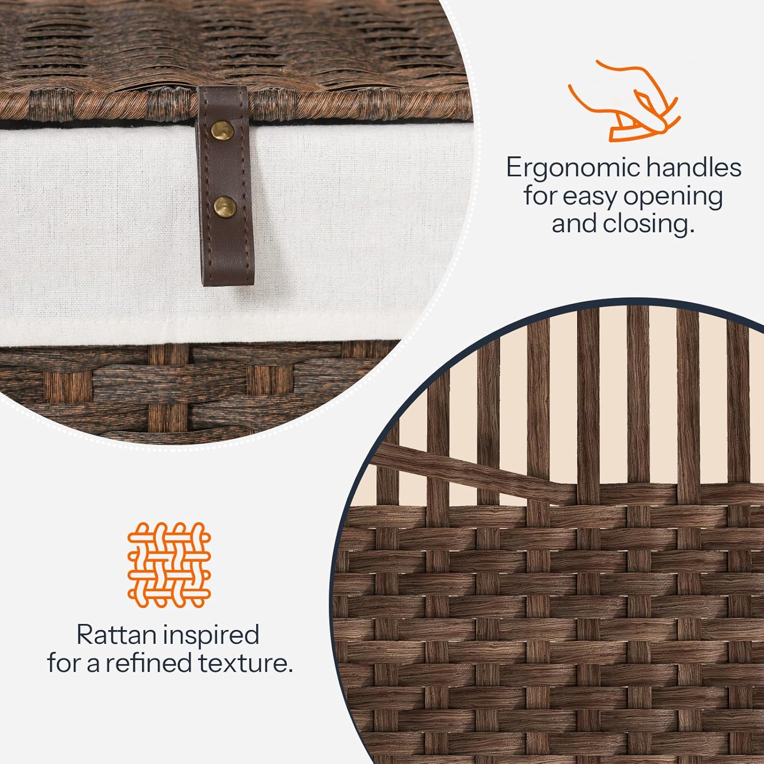 • Premium and Easy-to-Clean Material: The boho storage bin uses high-quality PVC rattan for its exterior, which is waterproof and breathable. The interior has a soft cotton-polyester lining that protects clothes and can be easily detached for cleaning