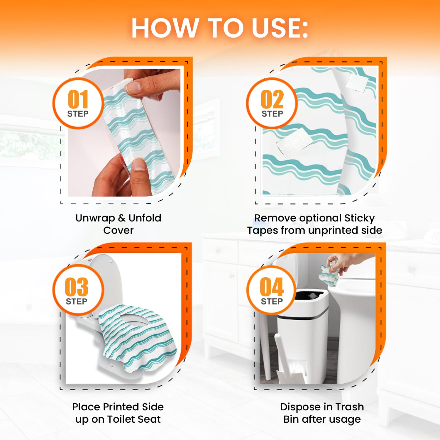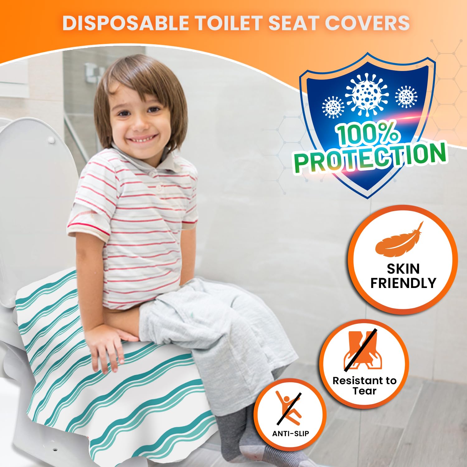 • WATERPROOF PORTABLE POTTY SOLUTION FOR KIDS: Our disposable kids toilet seat covers include dual layers to keep your little one 100% dry. These toddler potty covers fully cover the sides & front and its best for kids potty seat toilet cover