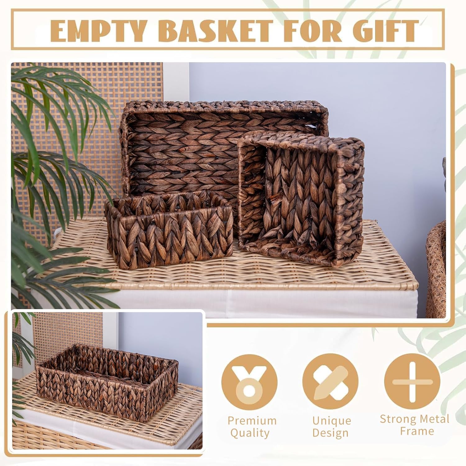 Handwoven Wicker Storage Baskets Set, Natural water hyacinth & Iron Frame | Triple Sizes (Small, Medium, Large) for Home Organizing, Bathroom, Shelves | Woven Baskets for Storage & Decor (Dark Brown)