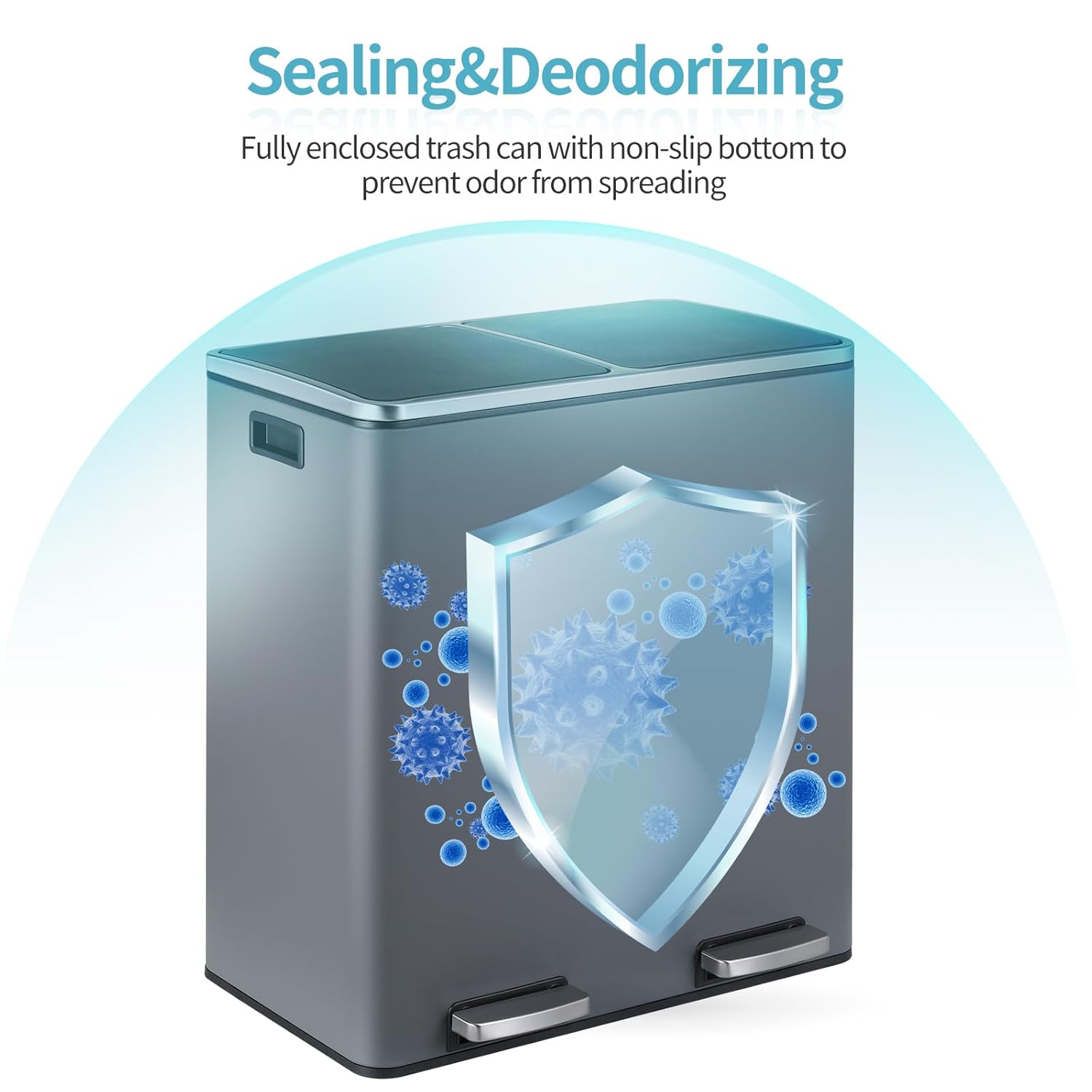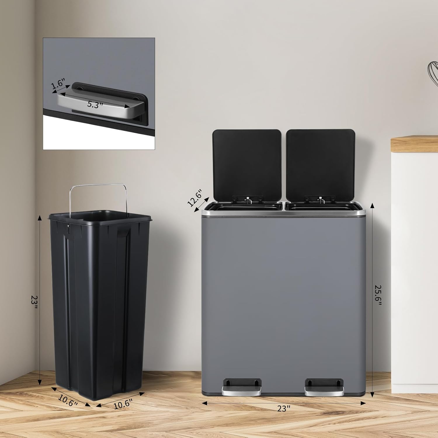 • Free-Hands : Dual compartment trash can uses a foot pedal switch, which can free your hands. Widened pedal also makes it more comfortable to step on. Dual kitchen trash can also has a portable handle, making it easy to move the hands free trash can