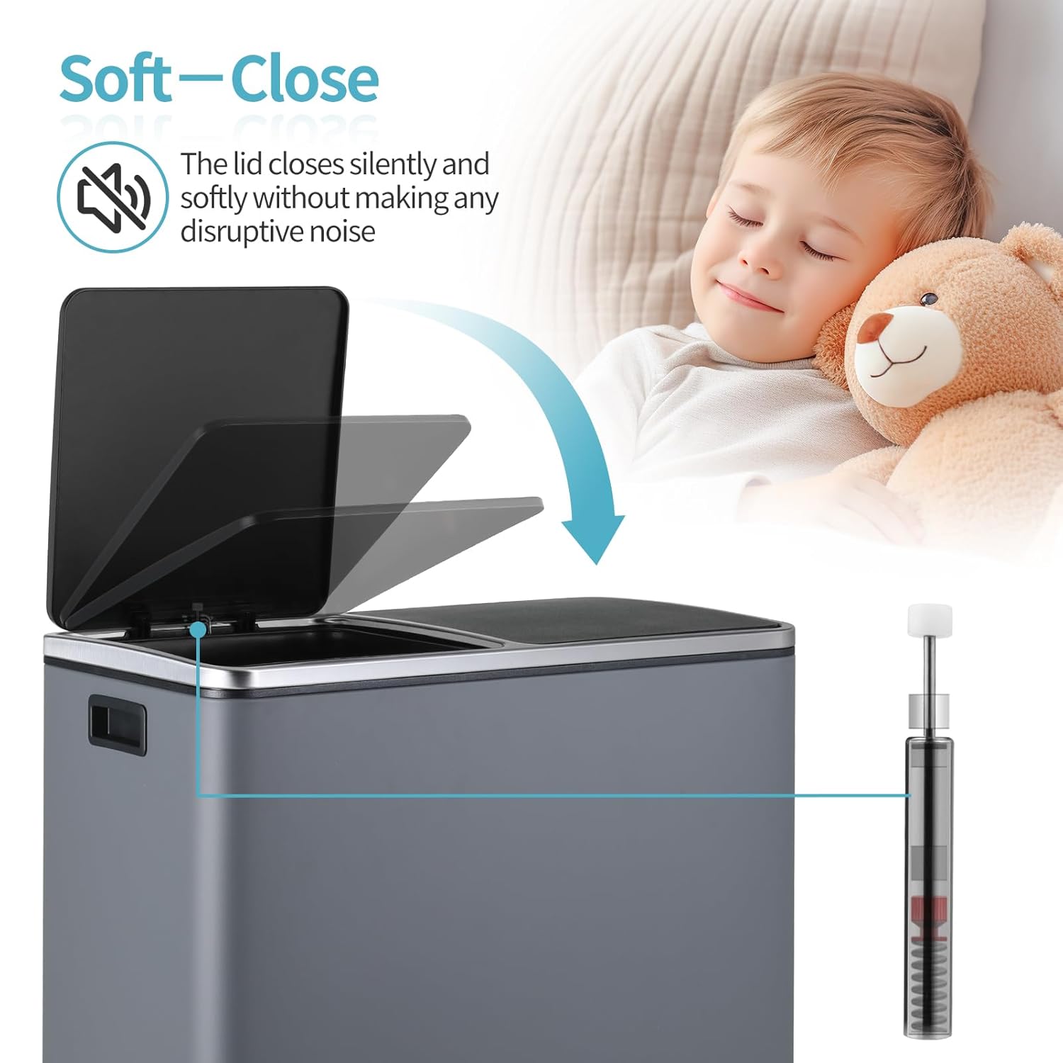 • 2 Slow-Down Lids: Kitchen trash can with lid made of ABS plastic is designed with slow-down. Slow-down lids can keep the recycle bins for kitchen silent and reduce wear. At the same time, the lids have locks that can keep the dustbin open when in use