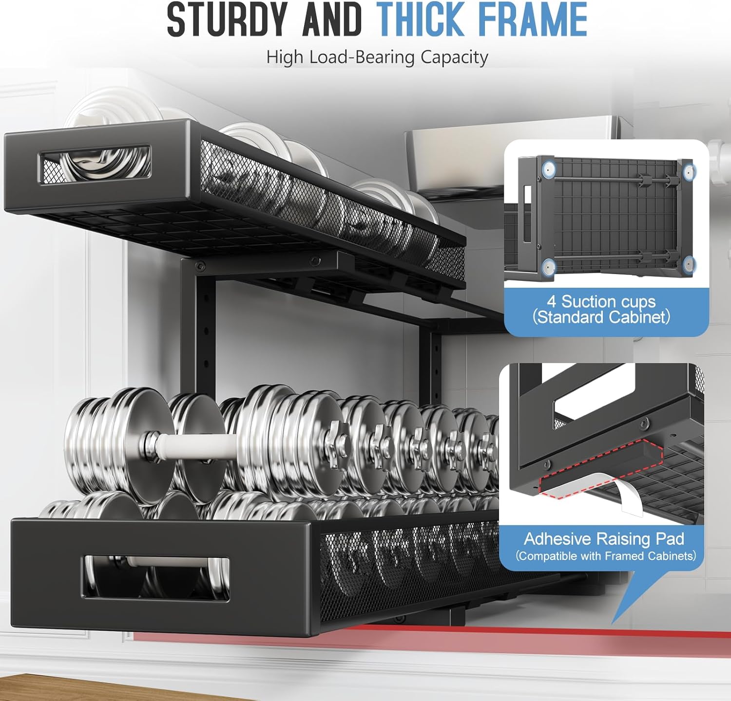 • 【2-Tier Pull-Out Design for Easy Access】This under-sink organizer features a double-layer pull-out design, allowing you to easily access items at the deepest part. The upgraded, thickened iron circular sliding rails ensure a smooth and seamless pulling experience, making each use effortless. The unique pull-out locking mechanism effectively prevents the drawers from being completely pulled out, avoiding the risk of items falling or structural damage caused by over-pulling, ensuring safer and more convenient use.