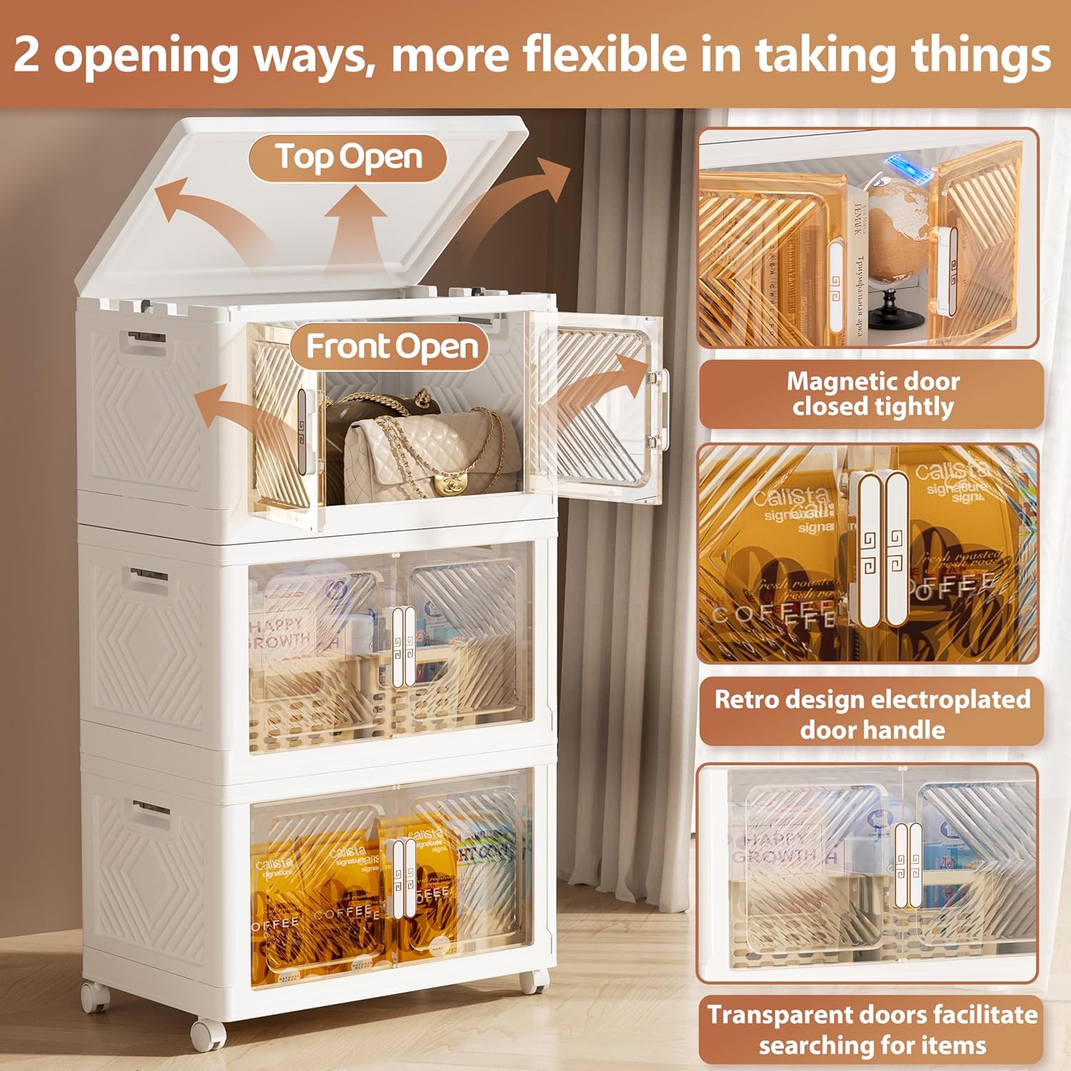 • 【Double Door & Visual Design】The storage boxes can be opened from the front doors and the top lid, 2 opening ways are convenient for retrieving items from different directions. The top lid makes it easy to quickly access large items, such as clothes and blankets. Powerful magnets are built into the front door to ensure that it will not automatically open. The door is made of transparent material, making the clear storage bins visible, so you can quickly find the items you need and save your time