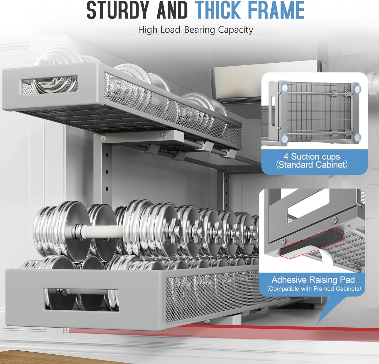 • 【2-Tier Pull-Out Design for Easy Access】This under-sink organizer features a double-layer pull-out design, allowing you to easily access items at the deepest part. The upgraded, thickened iron circular sliding rails ensure a smooth and seamless pulling experience, making each use effortless. The unique pull-out locking mechanism effectively prevents the drawers from being completely pulled out, avoiding the risk of items falling or structural damage caused by over-pulling, ensuring safer and more convenient use.