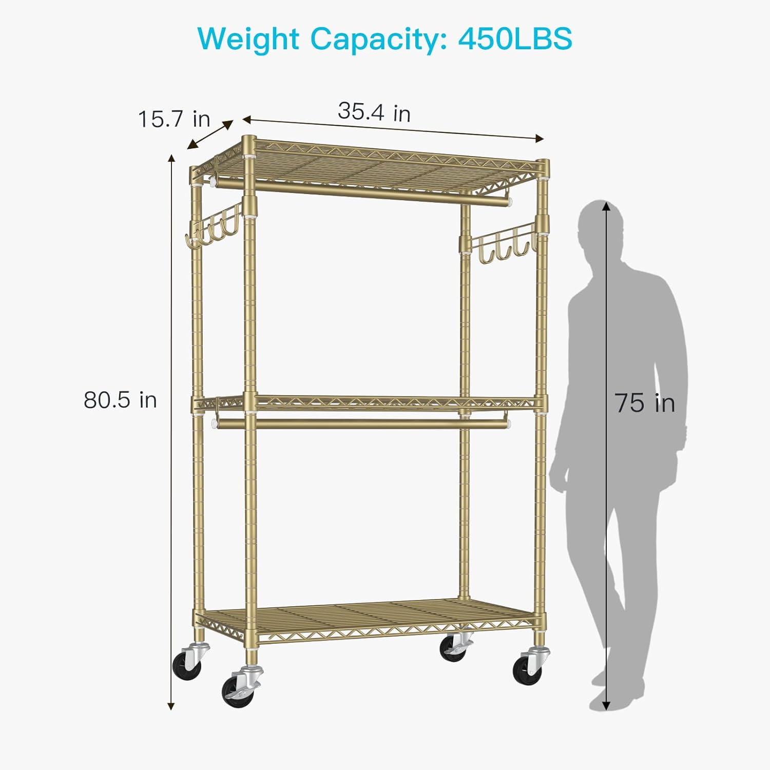 FUTASSI P1 Rolling Clothes Rack, Movable Metal Garment Closet Organizer with Lockable Wheels, Clothing Wardrobe with Double Hanger Rods and Hooks, 35.4" W x 15.7" D x 80.5" H, Load 450lbs, Gold