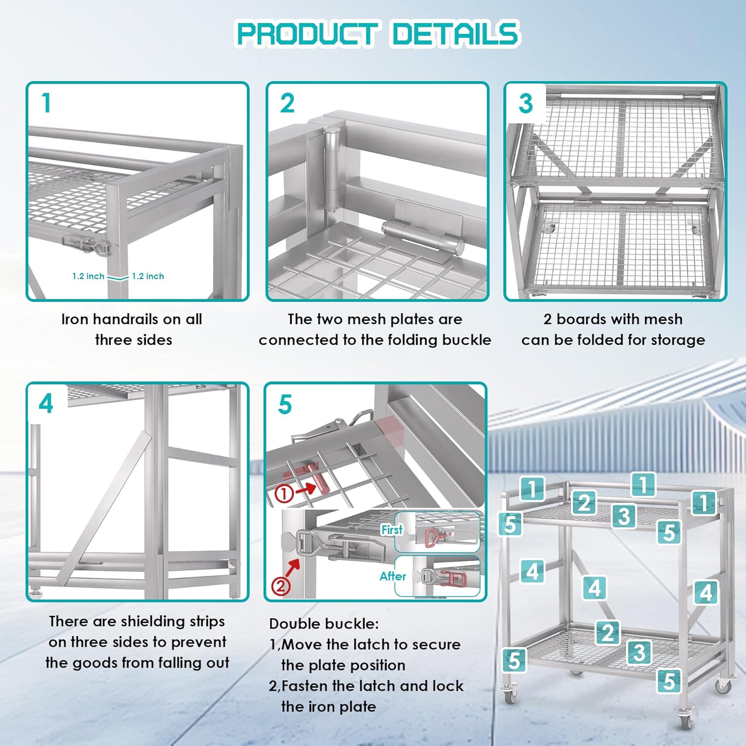 2 Shelf Rolling Cart with Wheels, 660lbs Capacity Collapsible Steel Rolling Utility Cart, Heavy-Duty Foldable Hand Truck, Metal Storage Carts with Handle for Groceries, Warehouse (36" Lx26 W)