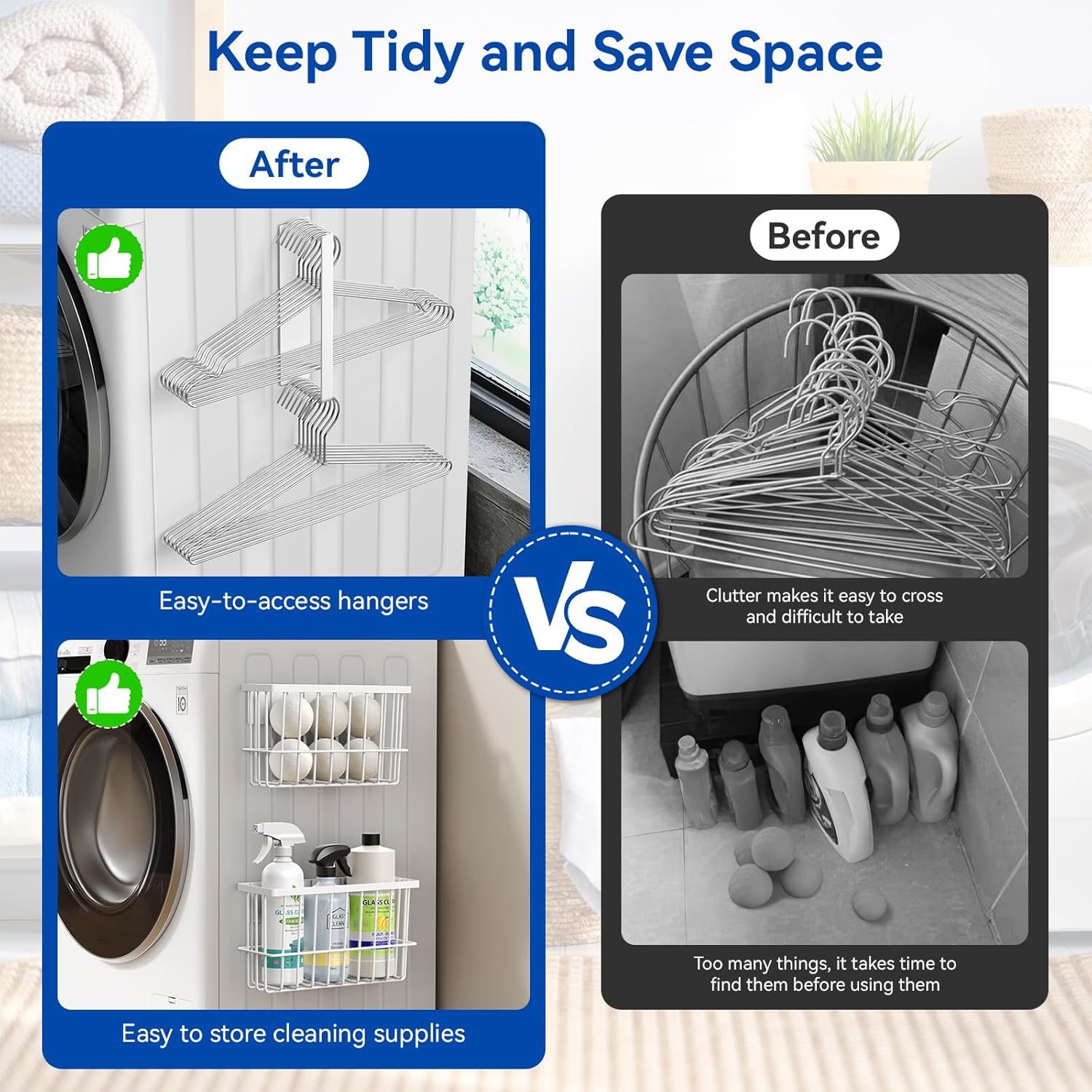 • Maximize Laundry Room Organization and Storage Space: The magnetic dryer ball holder and hanger organizer can be placed on the side or front of the dryer for easy to access and saving space on the laundry countertop. The small space in a small laundry room can also be reasonably utilized, and there will be no more messy placement and scattering.