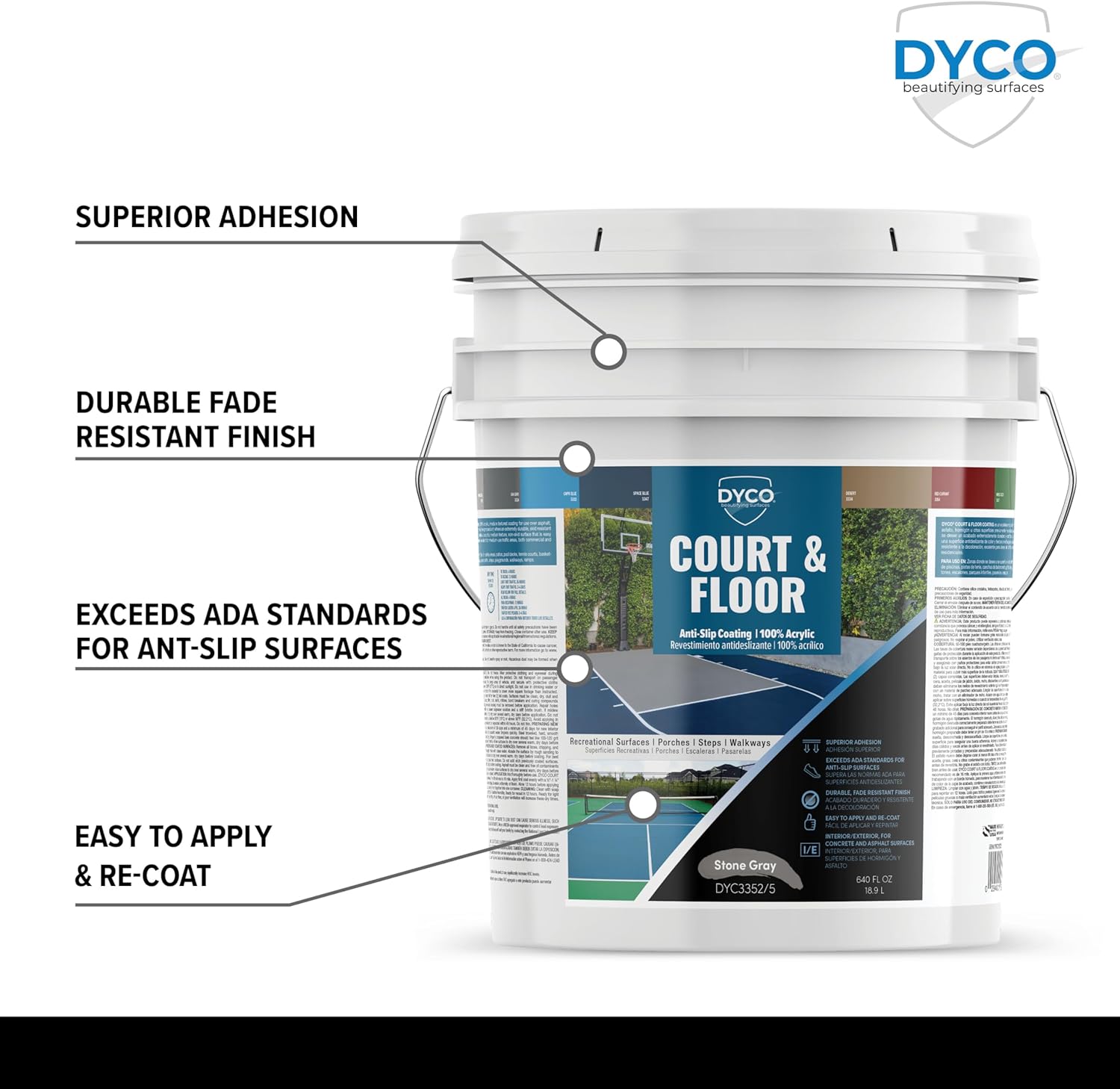 DYCO Court & Floor Anti-Slip Coating - Slip-Resistant Pavement, Cement & Concrete Paint for Pickleball, Tennis & Basketball Courts, Exceeds ADA Standards for Safety Areas (Stone Gray, 5 Gallons)
