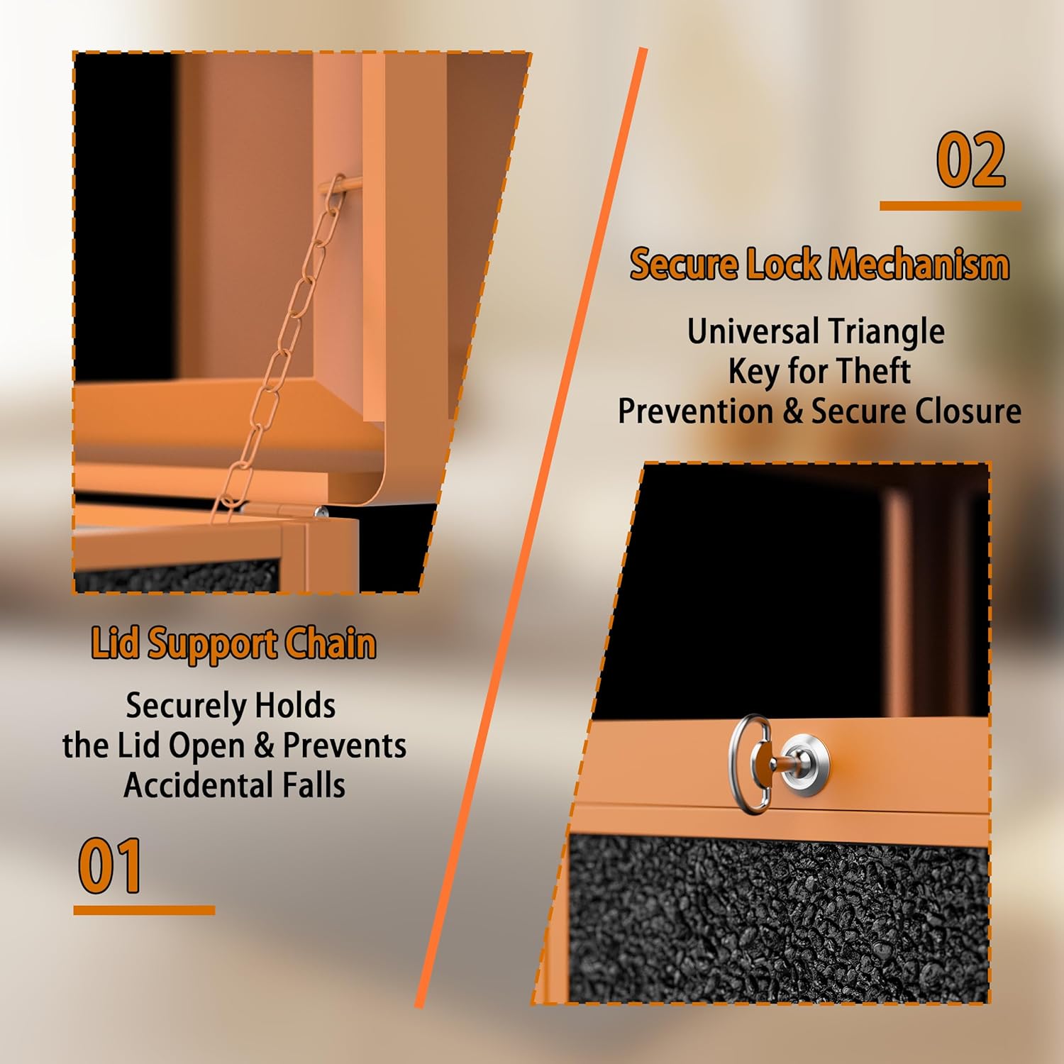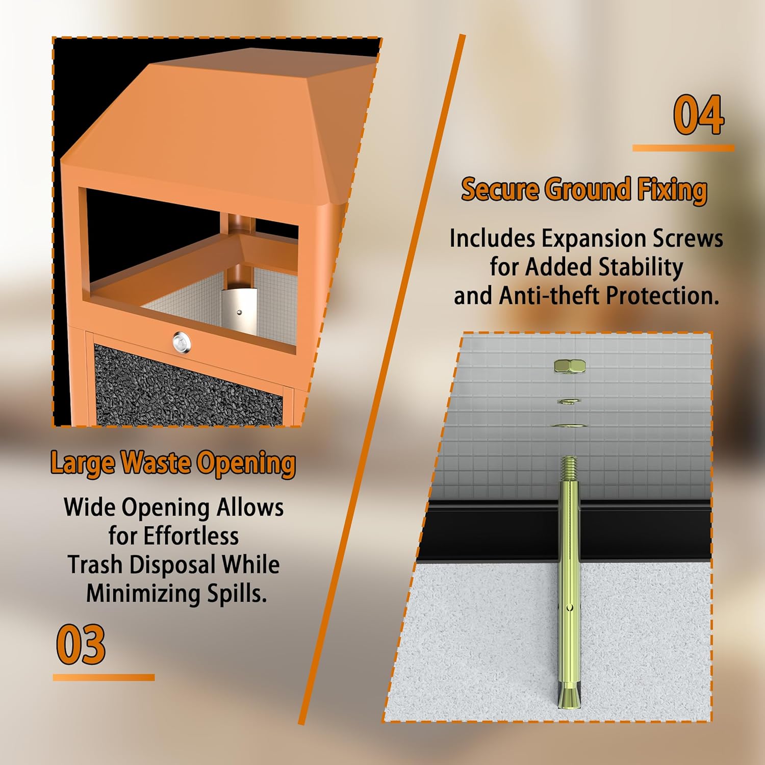 • 【Lockable outdoor Garbage Can with Secure Mounting】 Triangle-key lock prevents tampering, while pre-drilled holes and screws allow stable ground installation for permanent, theft-resistant placement.