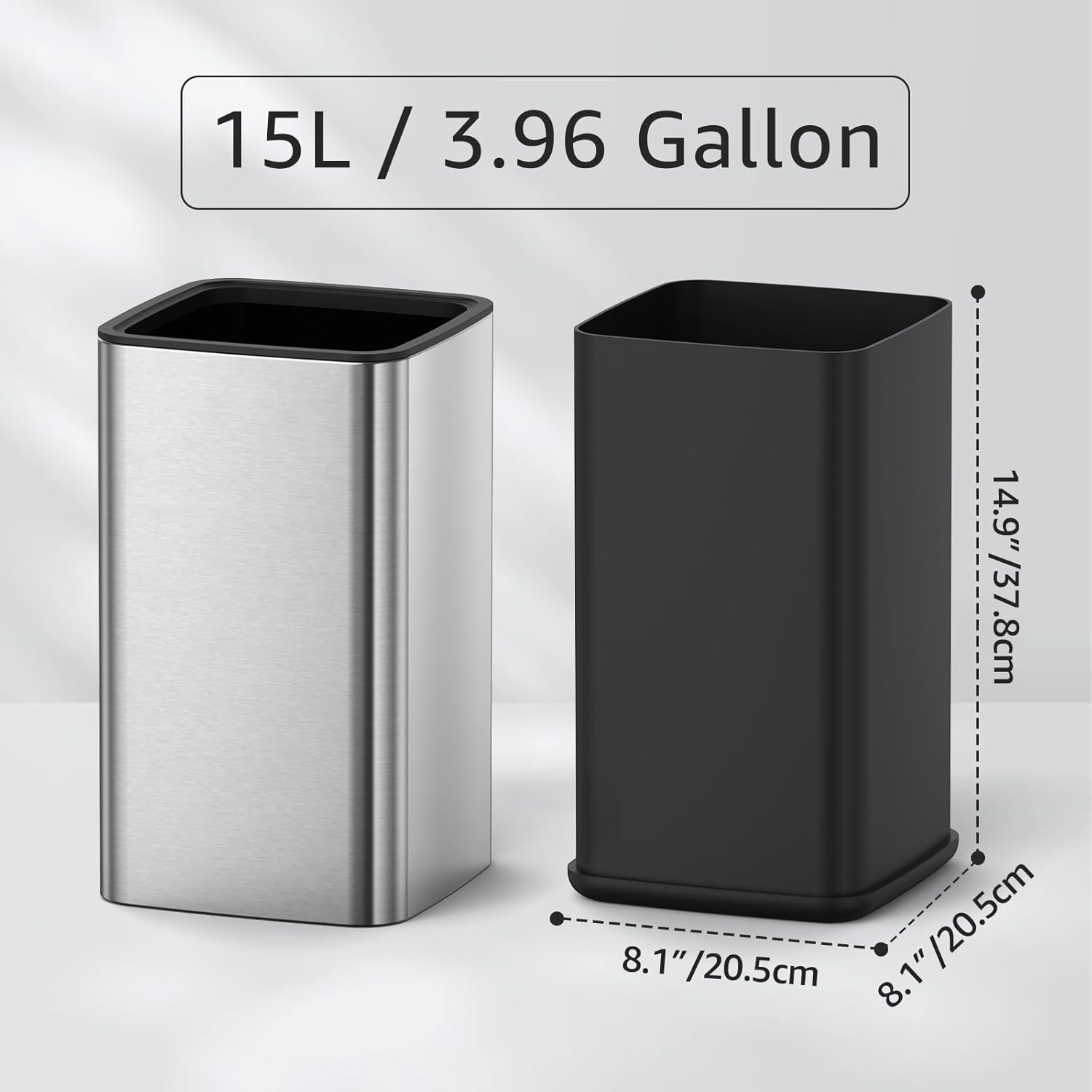 Mbillion 4 Gal/15L Open top Trash Can with Removable Inner Bucket Small Waste Basket, Metal Trash Can for Bathroom Office,Stainless Steel