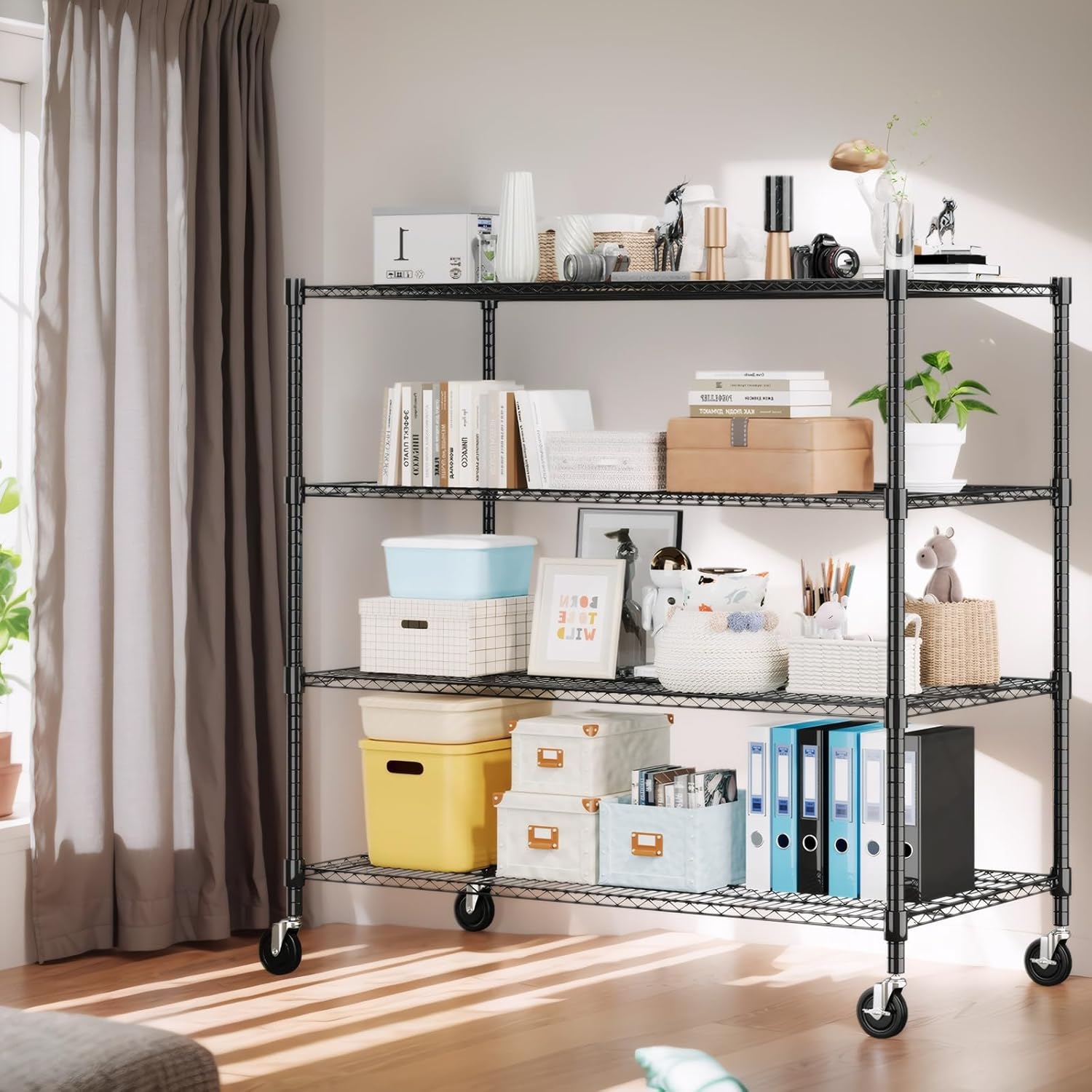 Himimi 4 Tier Wire Shelving with Wheels Heavy Duty Height Adjustable Metal Shelves for Storage, Commercial Grade Steel Utility Wire Rack for Kitchen Garage Pantry Organization-24×48×72, Black