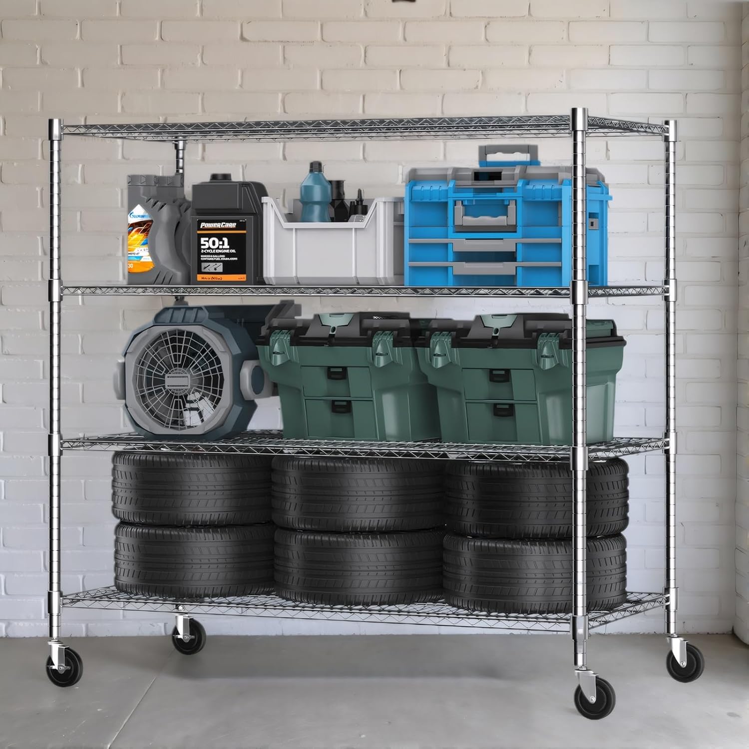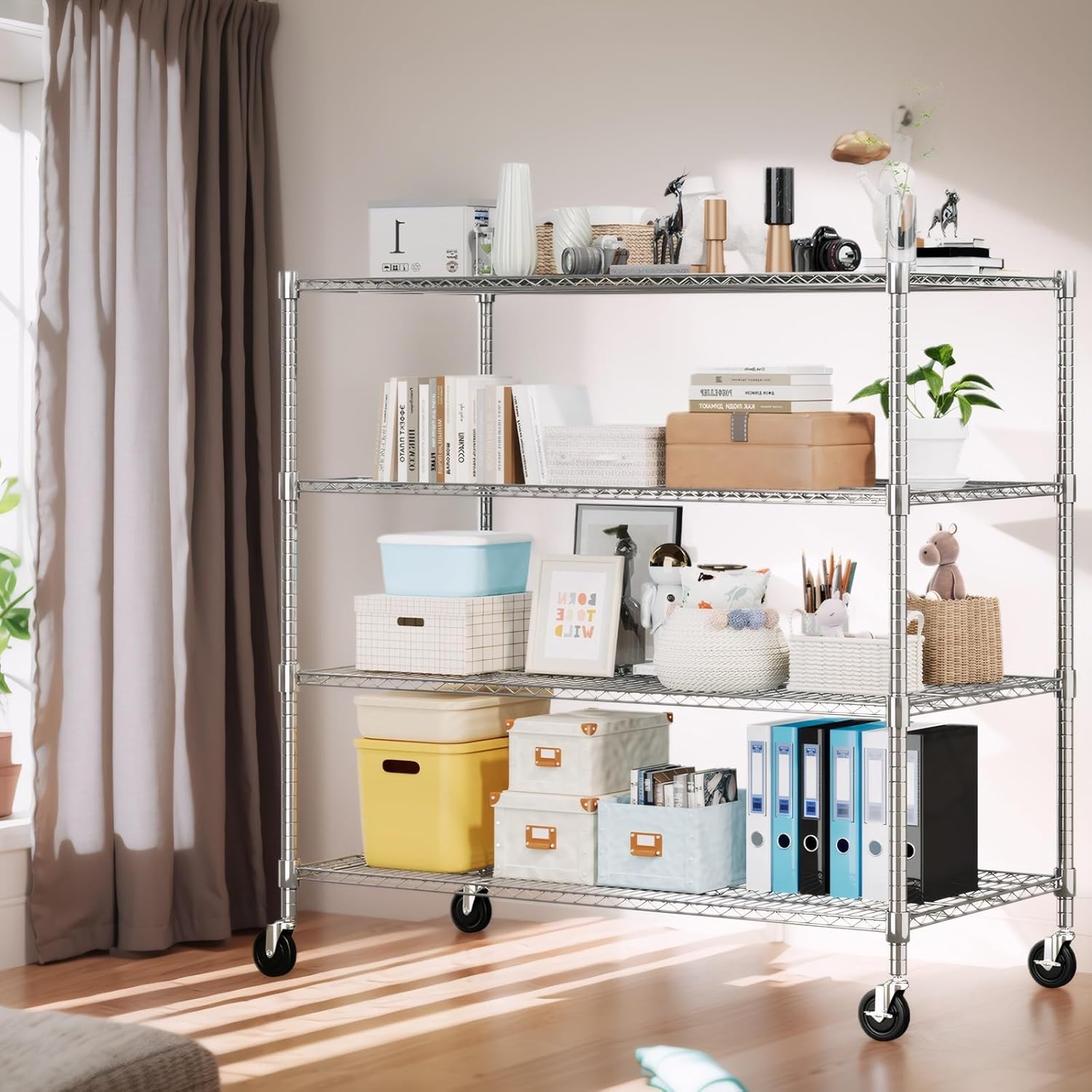 • 【LARGE STORAGE SHELVES】The size of metal shelving with wheels is 24" x 48" x 72" (76"H on leveling feet). This wire shelving can provide additional storage space without occupying too much space.The appropriate size makes the metal shelves for storage suitable not only for kitchens, bathrooms, storage rooms, living rooms, warehouses, basemnet, offices, commercial exhibitions, hotels, supermarkets, etc