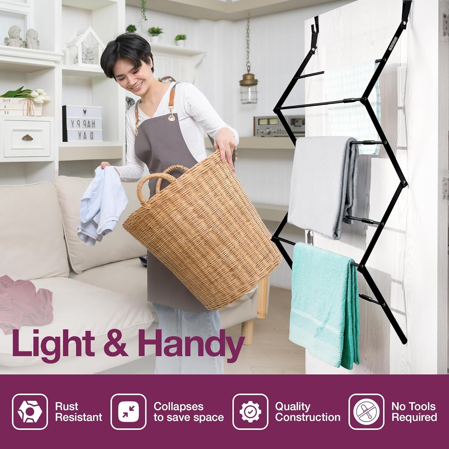 BLACK+DECKER Over The Door Expandable Telescopic Drying Rack, Clothes Organizer, Towel Hanger, Laundry, Collapsible, Black