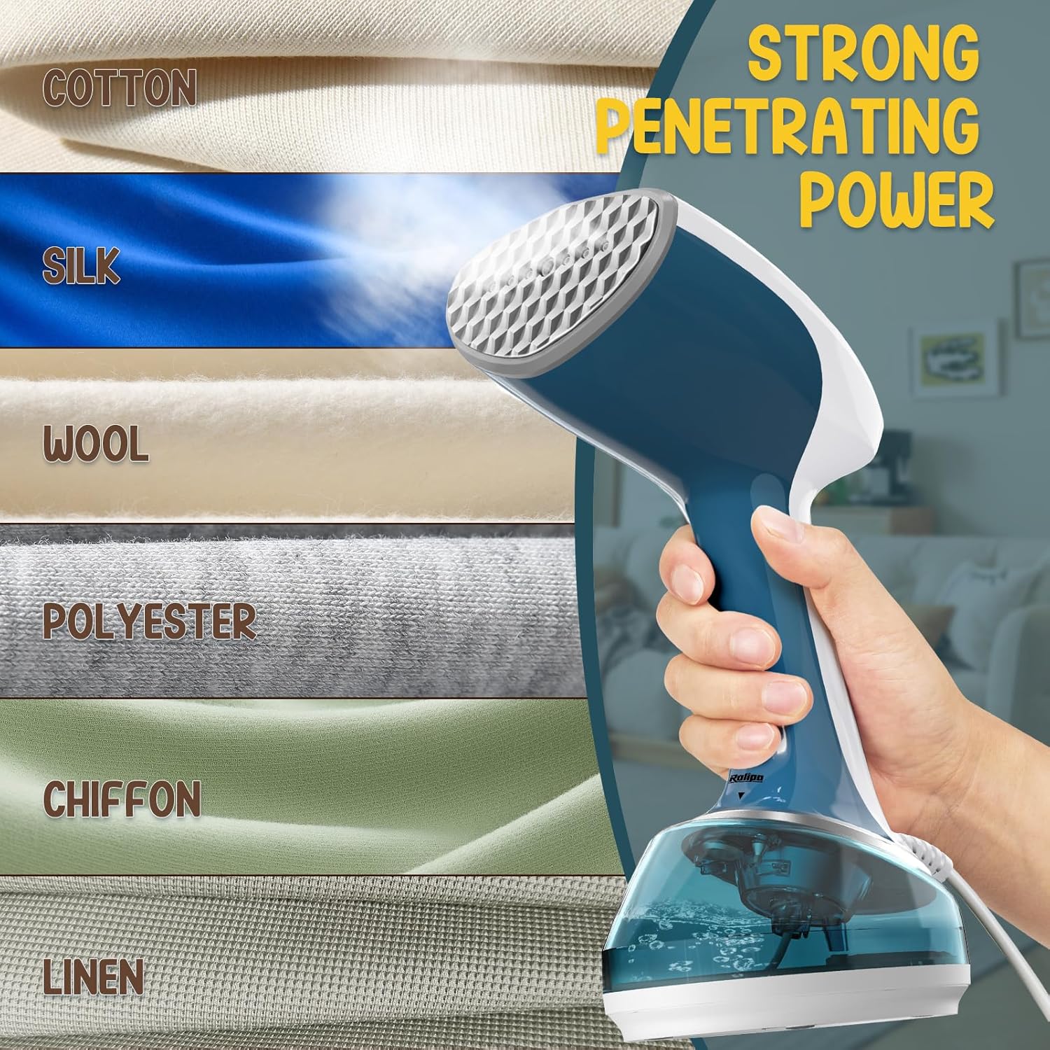 • 【Continuous Steam With One Switch】Rolipo handheld garment steamer has continuous steam function. Press the steam button and preheated for 25s for firstly continuous steam with no need to keep the button pushed down. Only one steam mode for using easily. You can iron thick fabrics such as wool, denim, cotton and plush material, aslo can be used for thinner fabrics such as silk, linen, nylon, etc.