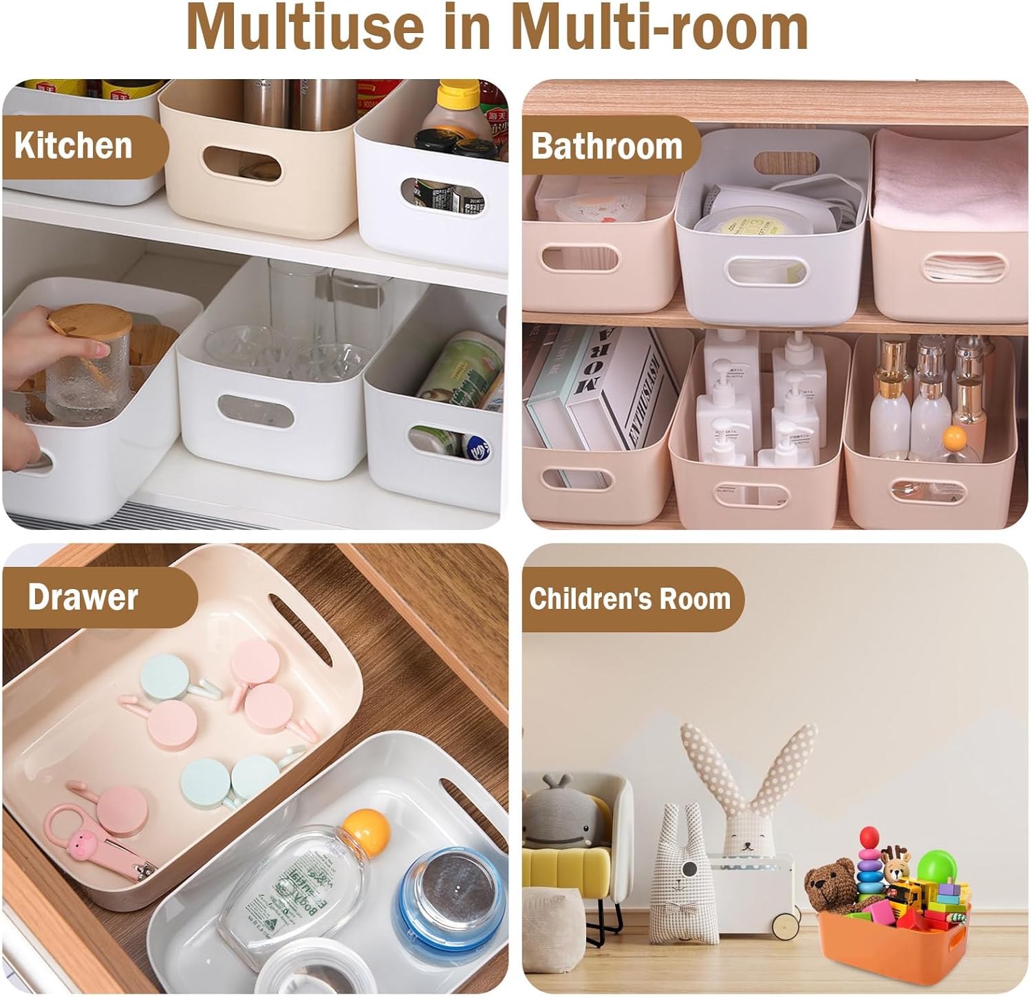 • Wide Application: These storage bins are ideal for use in a variety of settings, including bathrooms, bedrooms, kitchens, living rooms, studies, and offices, providing an efficient way to organize and declutter your space.