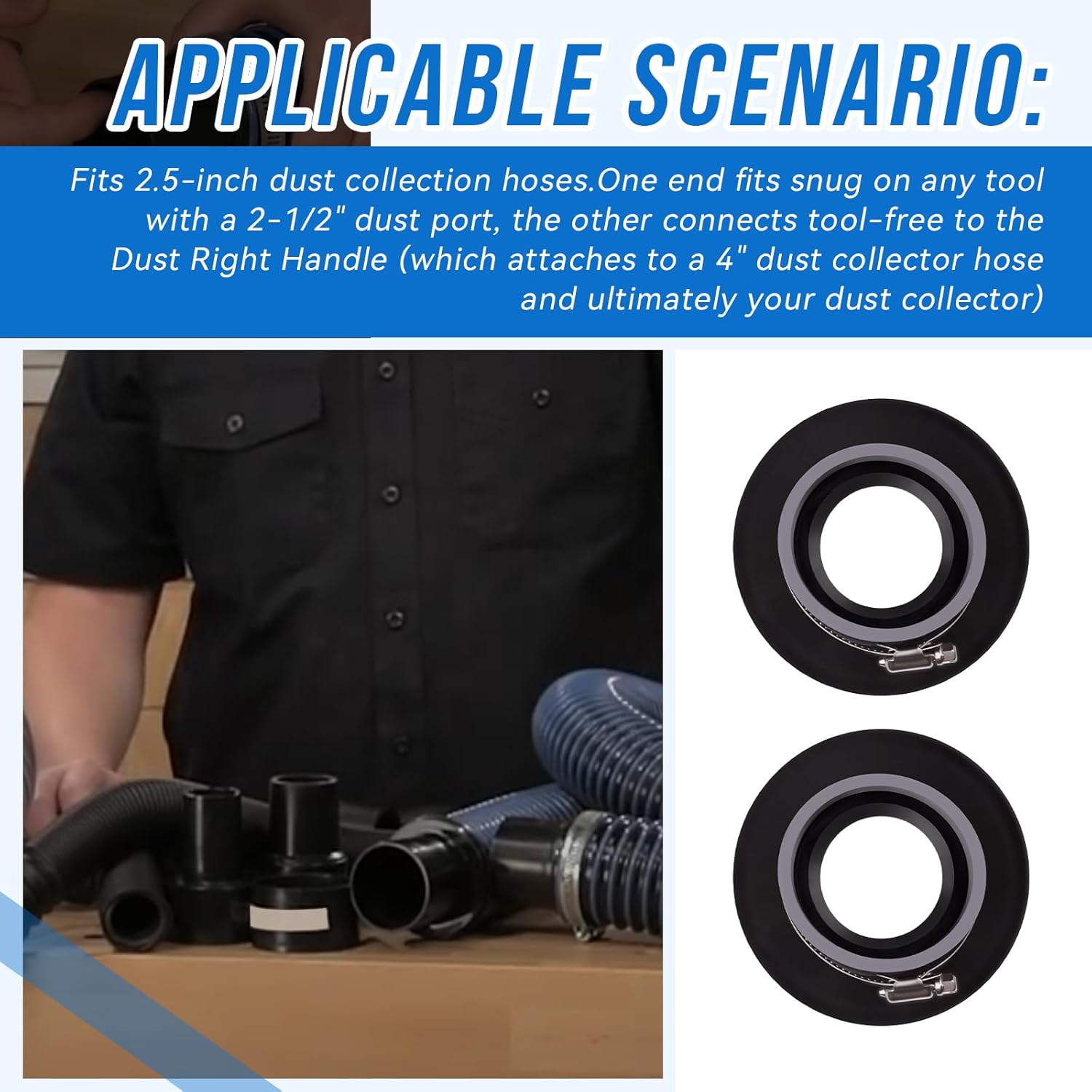 • APPLICABLE SCENARIO: Fits 2.5-inch dust collection hoses.One end fits snug on any tool with a 2-1/2" dust port, the other connects tool-free to the Dust Right Handle (which attaches to a 4" dust collector hose and ultimately your dust collector)