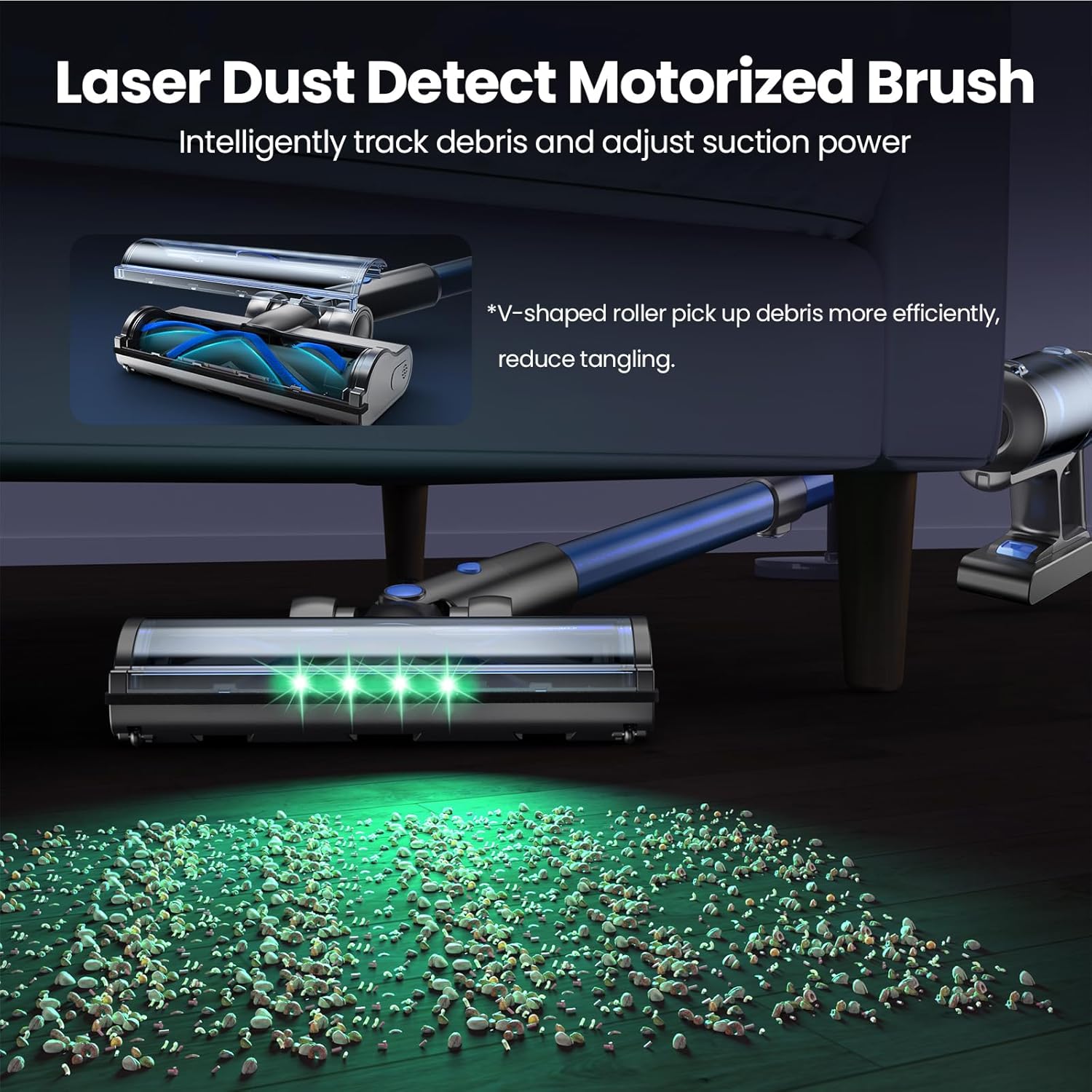 • 【Versatile Accessories】The main floor brush comes with green LED lights that make dust particles easier to see and clean. The V-shaped roller efficiently picks up debris while minimizing hair tangling, ideal for cleaning floors, carpets, and stairs. The 2-in-1 brush and crevice tool are perfect for cleaning furniture, car, and hard-to-reach areas, offering a multi-purpose cordless vacuum cleaner for home.