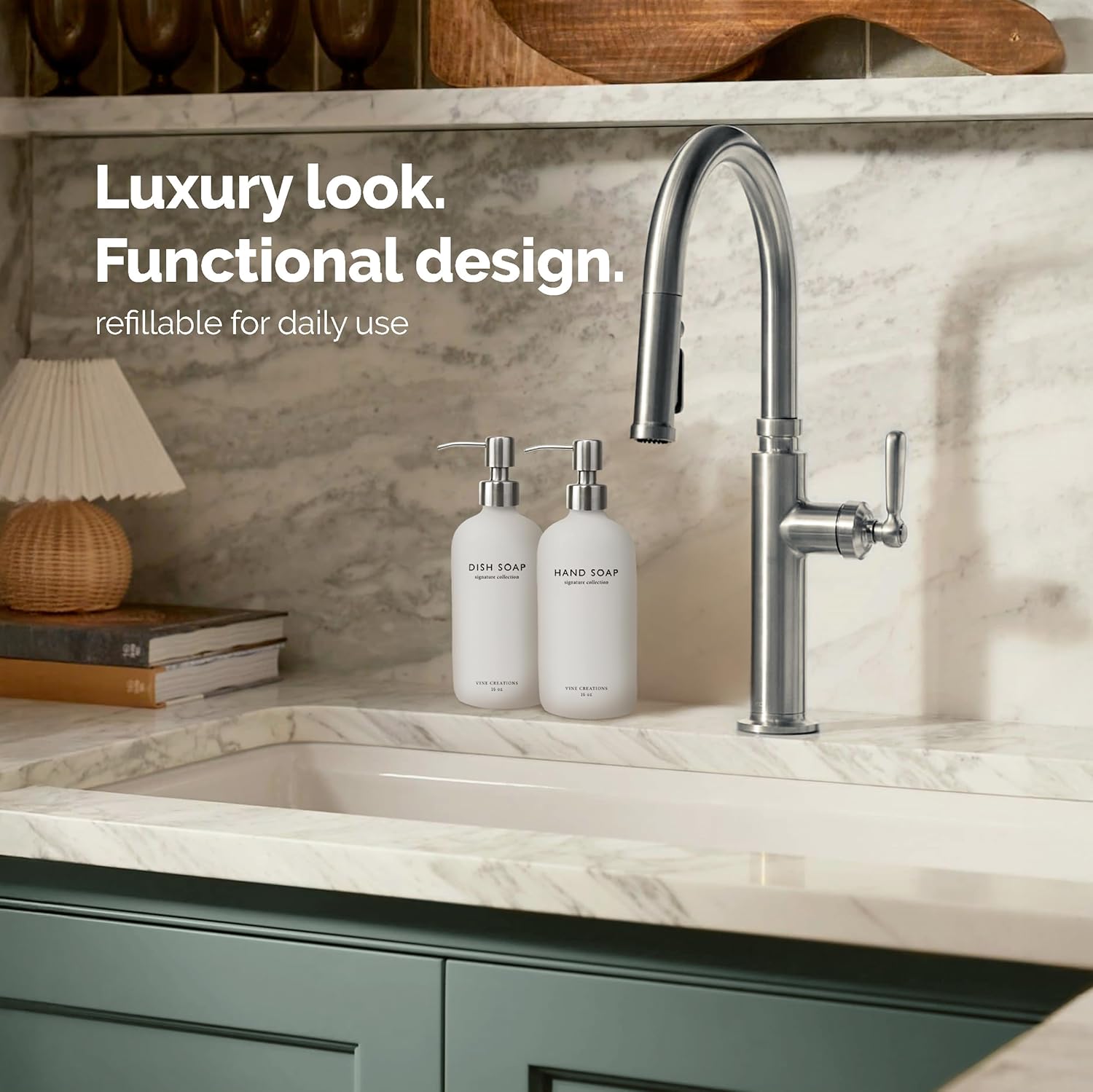 • PRINTED WITH PURPOSE – Hand Soap and Dish Soap are printed directly onto the glass in a refined, modern font—no stickers, no smudges. A minimal, permanent design that keeps your kitchen looking curated and clean.