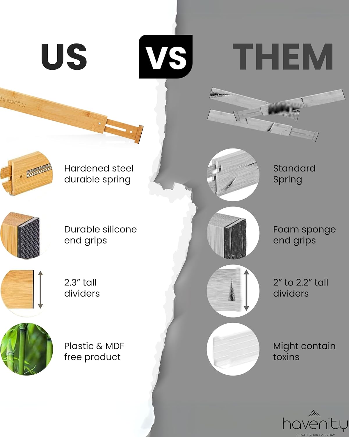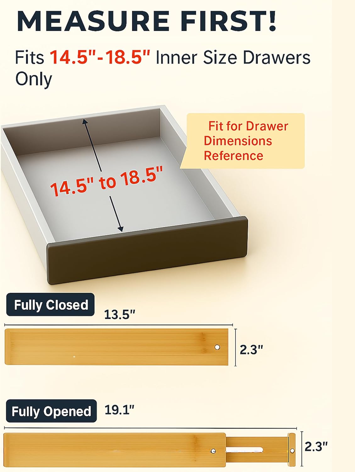 • EXPANDABLE ORGANIZATION: Our adjustable drawer dividers expand from 14" to 19.1"; You can be installed in your kitchen, bedroom, office drawers, baby's room, desk and bathroom.Our bamboo kitchen drawer dividers are equipped with non-slip pads on both ends, which helps to keep them in place and protect both the drawer and organizer itself.