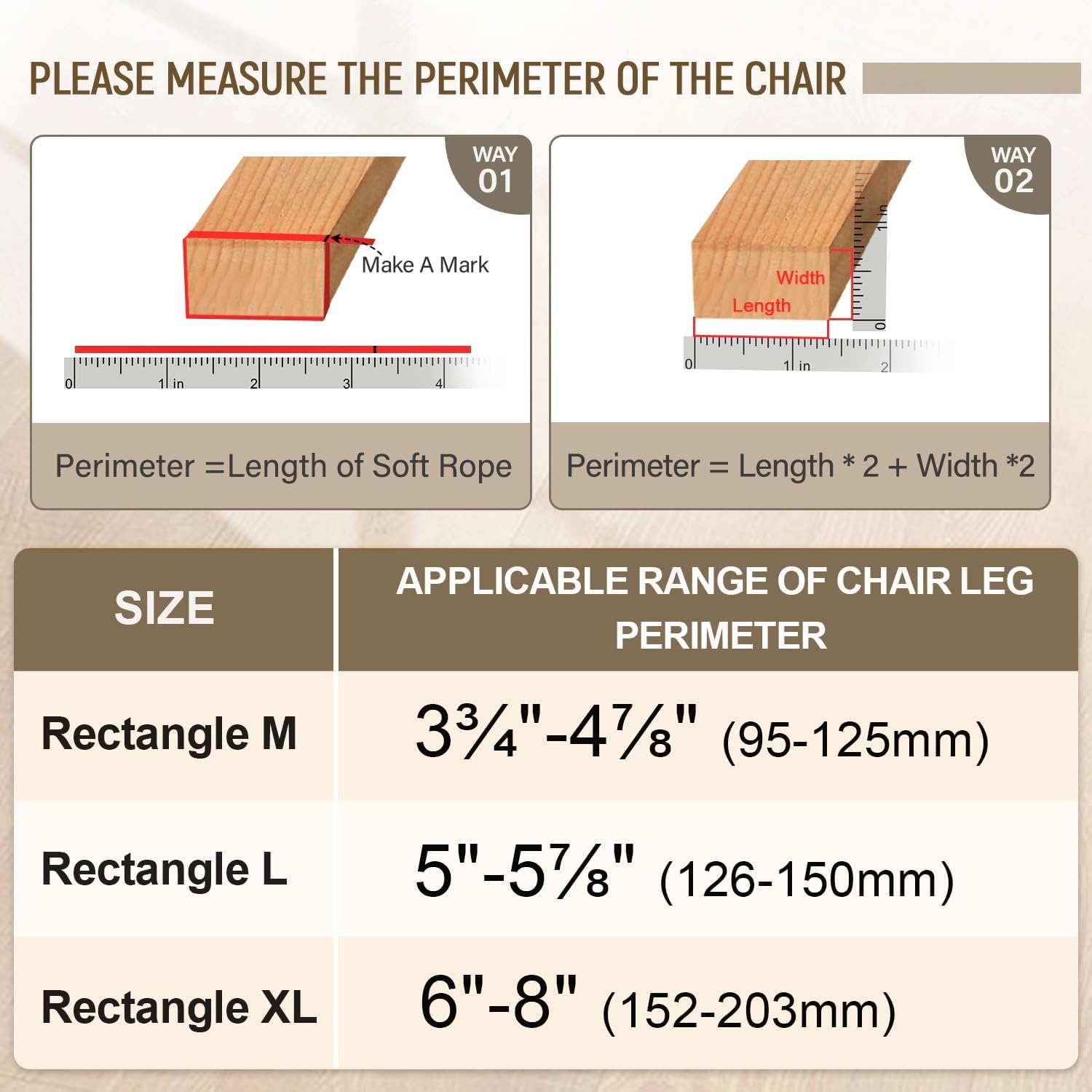 • Size application: They fit snugly on different chair legs. Measure the side length and pick the size that matches: M(Perimeter: 3-3/4"~4-7/8")、L(Perimeter: 5"~5-7/8")、XL(Perimeter: 6"~8").