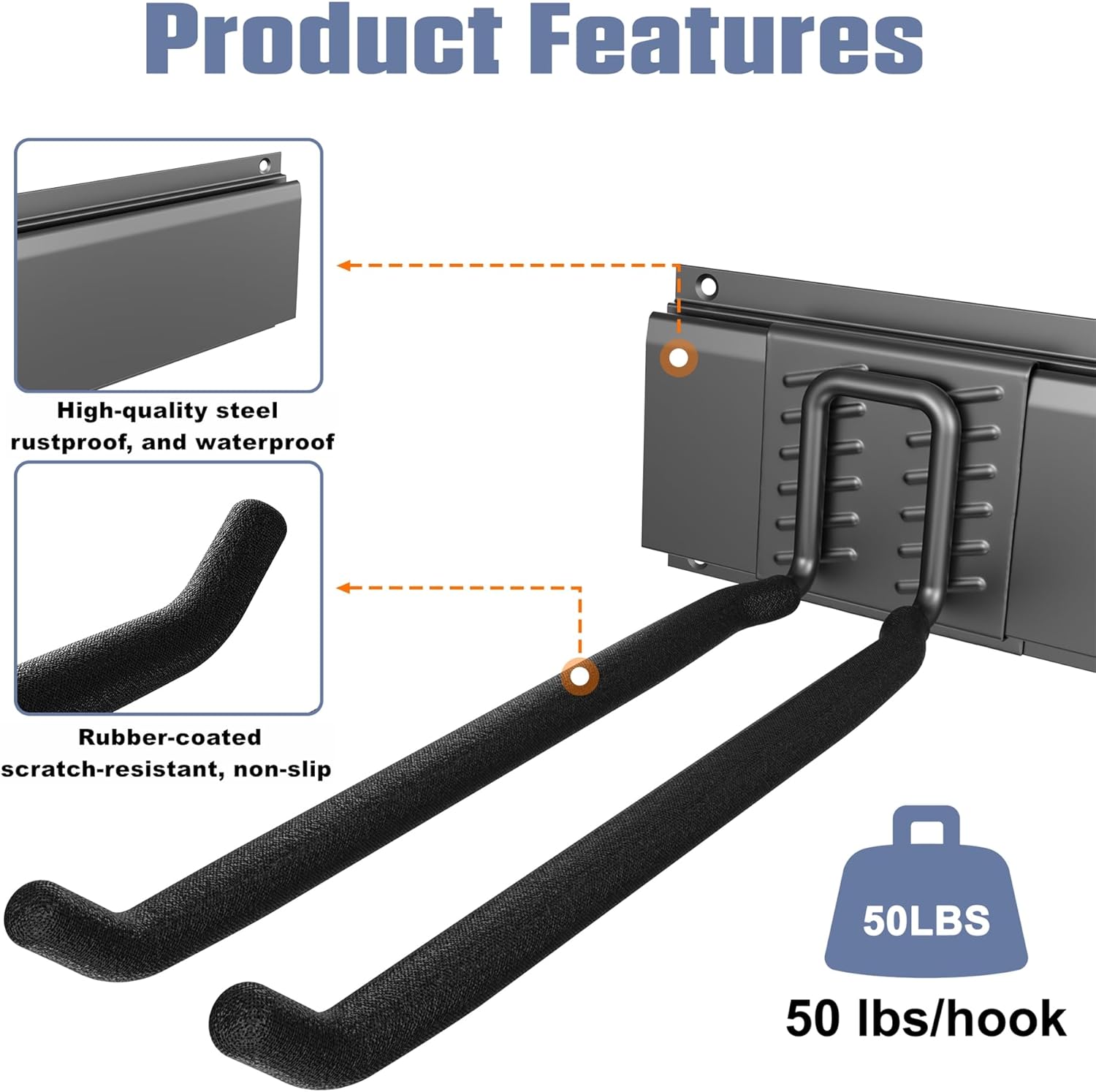• 8 Heavy-Duty Double-Prong Hooks: Each 11-inch hook holds 3-5 tools or 4-5 folding chairs, providing efficient storage for various items. Designed for secure and accessible organization