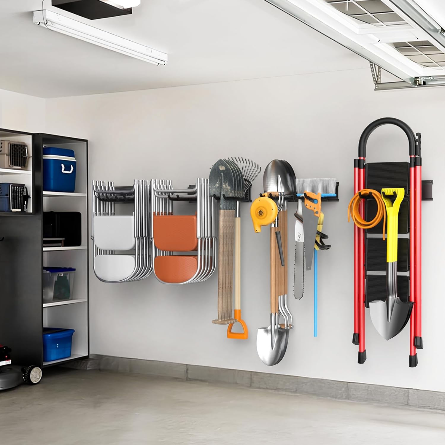 WALMANN Wall Mounted Garden Tool Organizer for Garage, Heavy Duty Folding Chair Storage Rack, 11-Inch Tools Storage Hooks for Shovels, Rakes, Ladders, Hold Up to 400 lbs