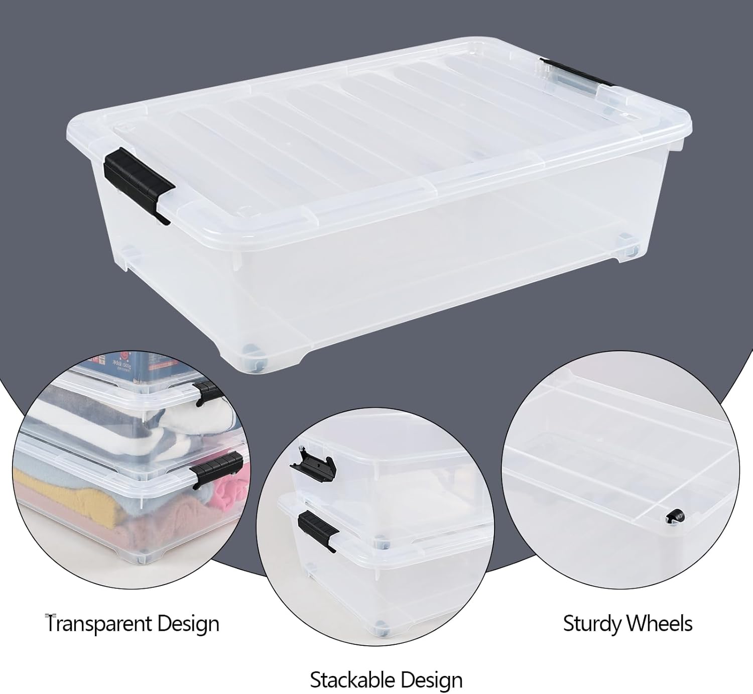 25 Quart Plastic Under Bed Storage Boxes, Wheeled UnderBed Storage Container, 3 Pack, Clear