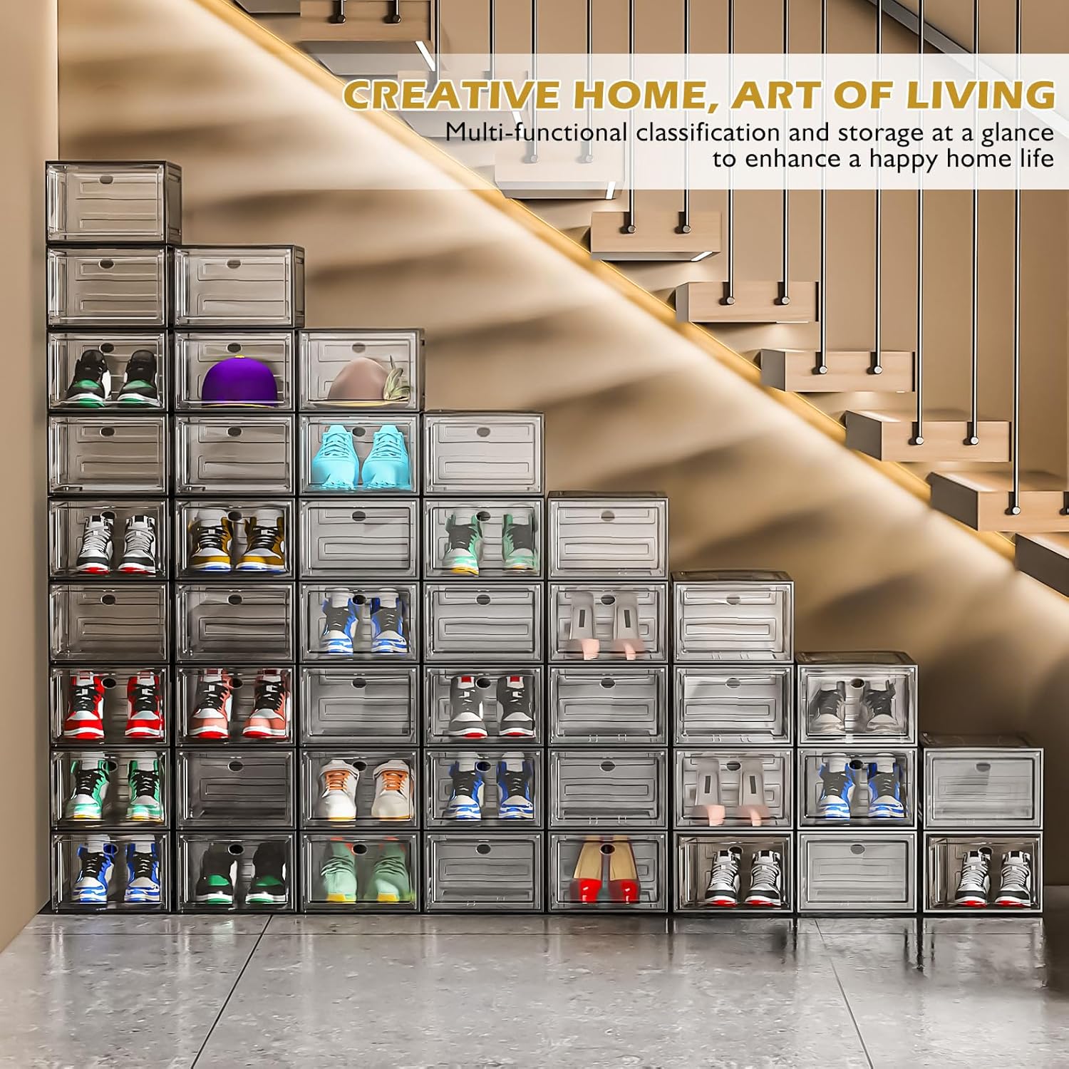 • 【Clear & Stackable Design】Easy to Use & Space-Saving Featuring a transparent magnetic front door and stackable design, these shoe boxes allow you to easily see and access your shoes. The interlocking pegs ensure safe and stable stacking, creating multiple layers of organized shoe storage